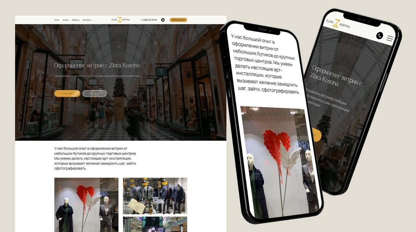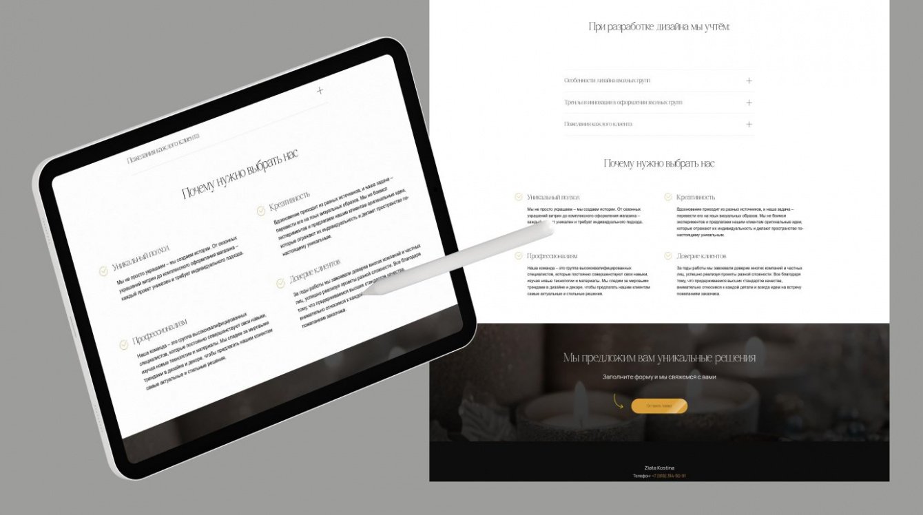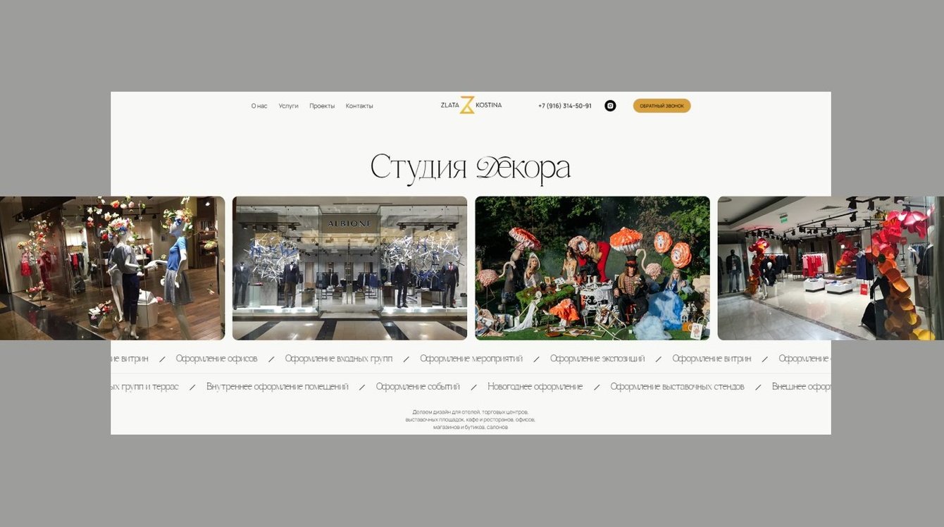 Сайт-портфолио получился таким же необычным и вдохновляющим, как и работы творческой команды заказчика. И мы, и клиент остались довольны результатами проделанной работы. Нам удалось создать такое же стильное и уникальное интернет-пространство, каким делают любое помещение дизайнеры бренда Zlata Kostina.