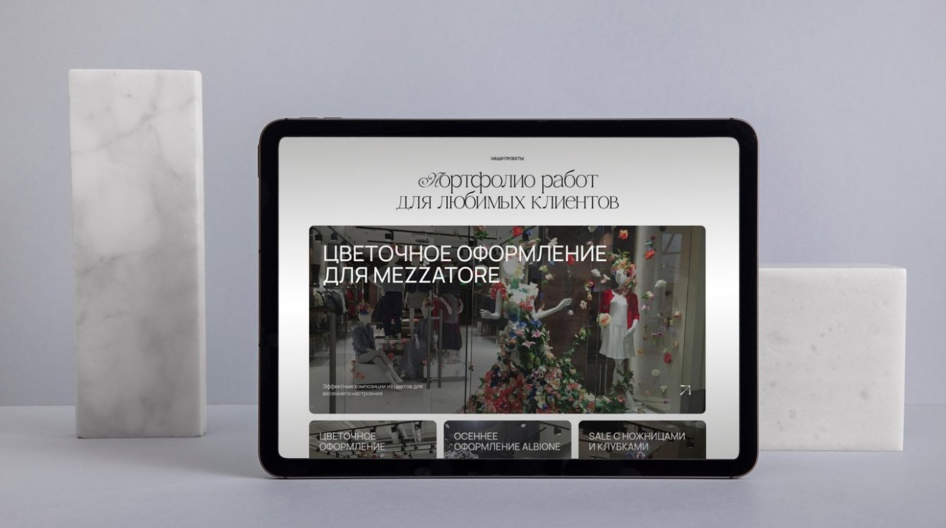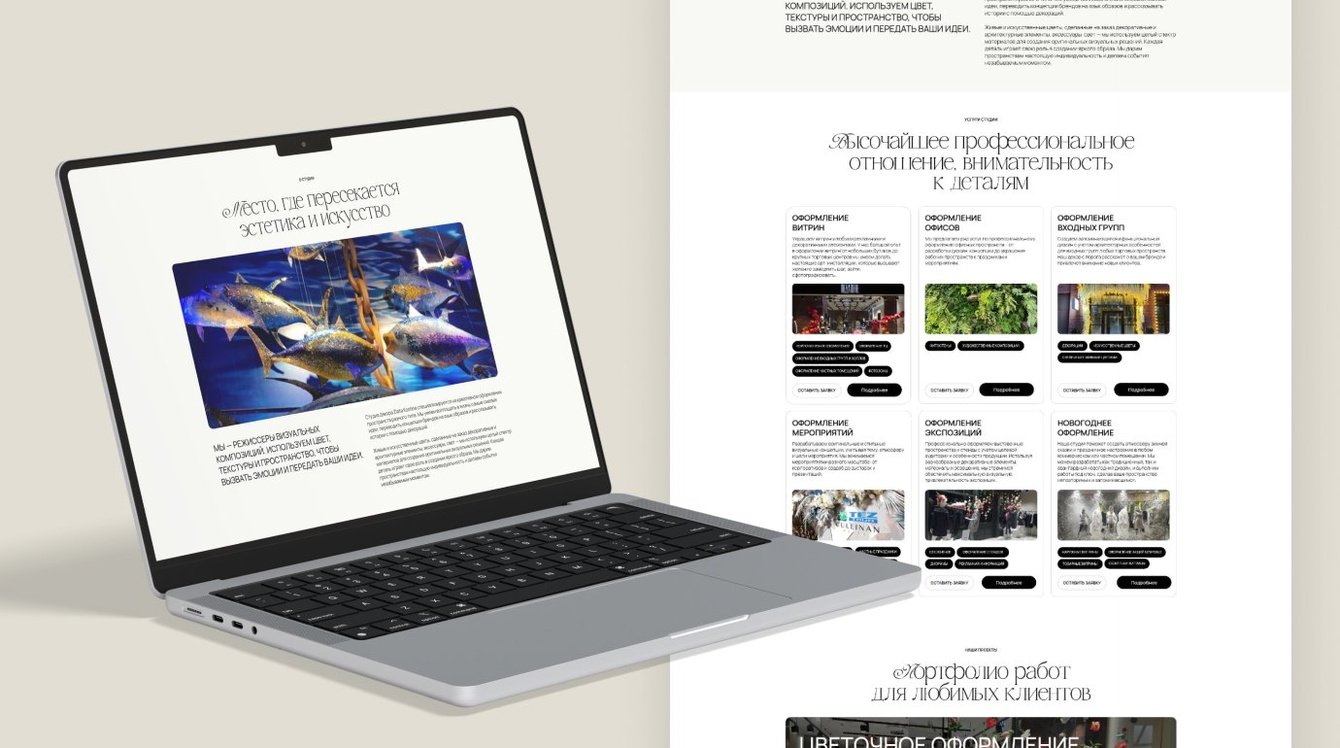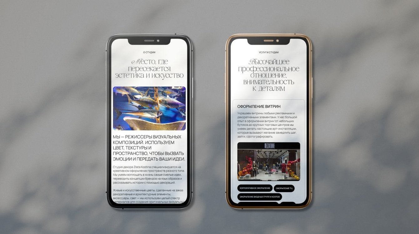 Поскольку сфера деятельности клиента – декорирование пространств, мы сосредоточились на том, чтобы подчеркнуть креативный подход клиента к каждому заказу.
