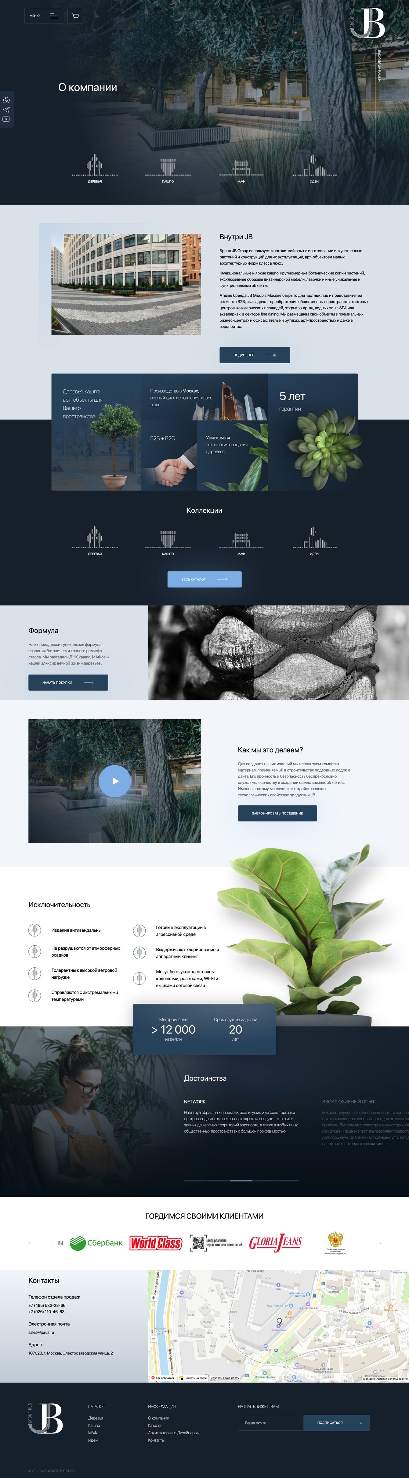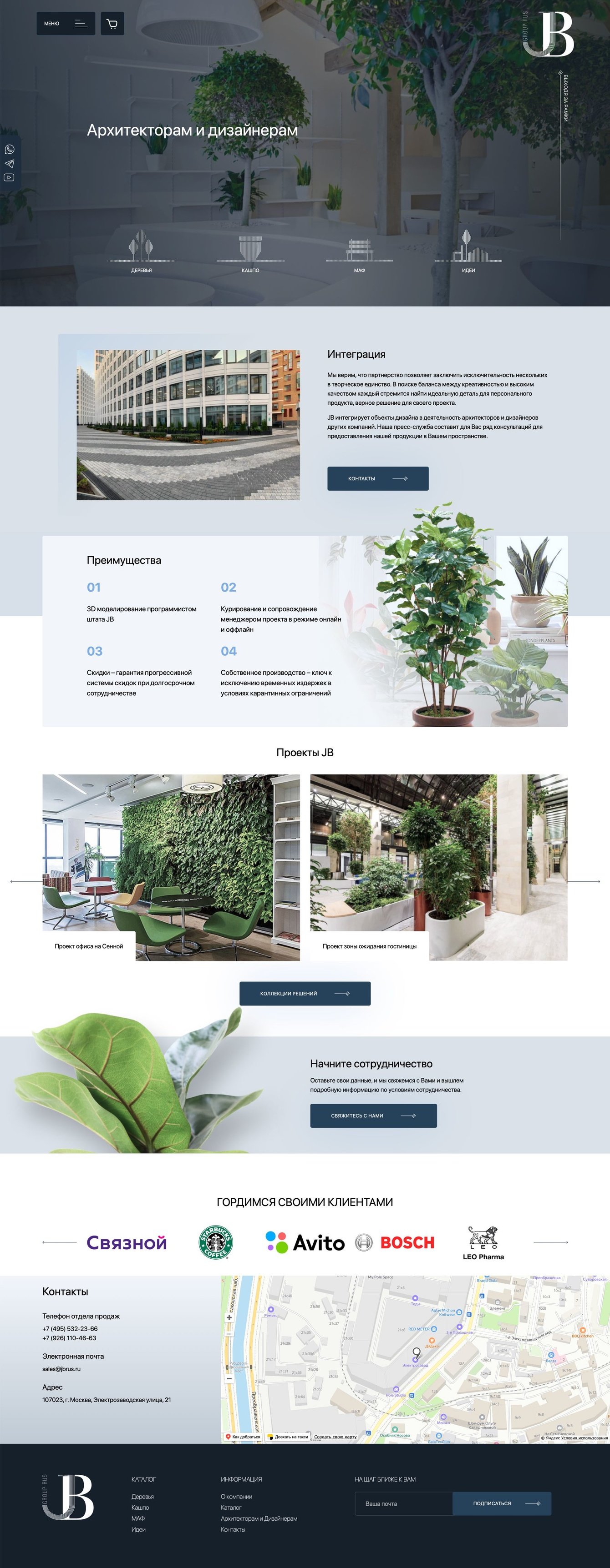Было принято решение разработать несколько страниц, подчеркивающих профессиональность компании, качество и индивидуальность её продуктов и готовность к заключению партнёрских отношений с архитекторами и дизайнерами. Также приняли необходимость разместить на сайте каталог товаров, с возможностью добавлять товары в корзину и оформить заказ.