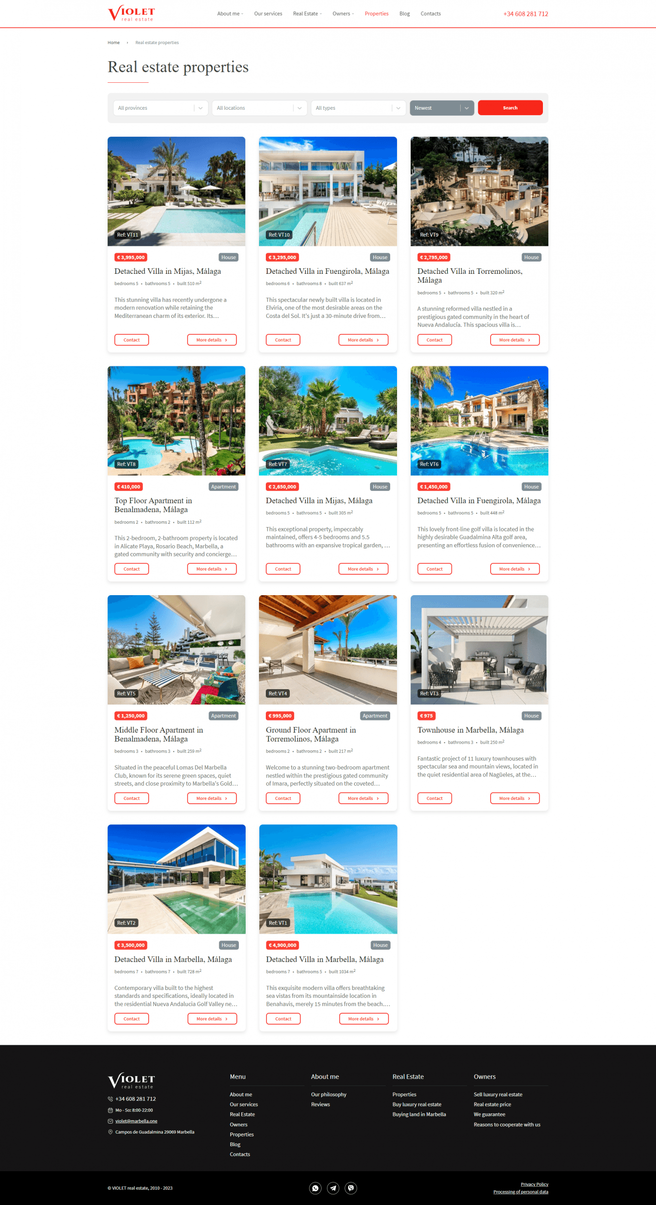 Результатом нашей работы стал современный и функциональный веб-сайт агентства по продаже элитной недвижимости на побережье Испании. Сайт имеет привлекательный дизайн, интуитивно понятную навигацию и удобную административную панель, что позволяет клиенту эффективно управлять контентом и предлагать потенциальным клиентам самые актуальные предложения.