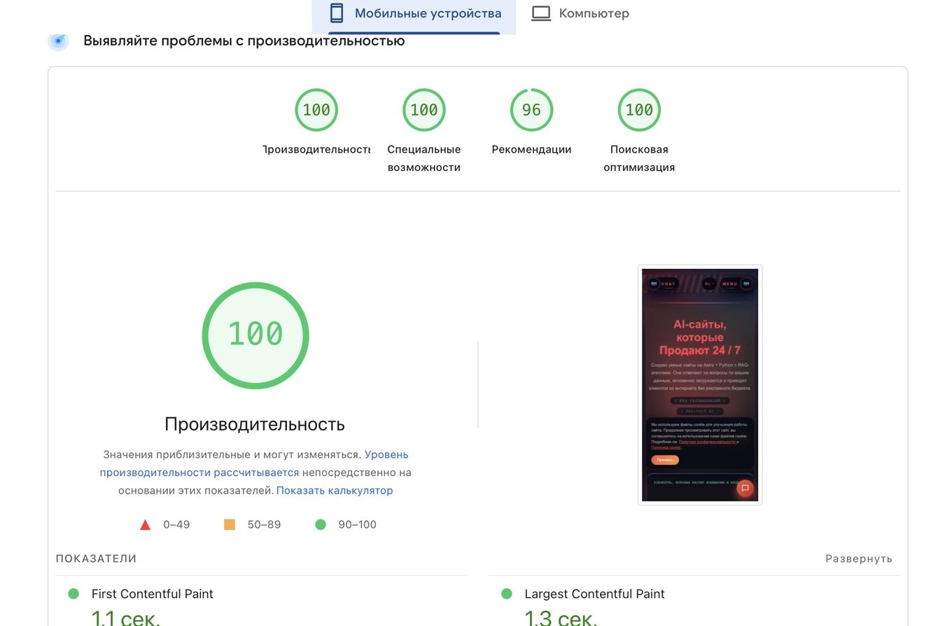 Собрал единый продукт: промо-сайт, AI-чат-виджет и связанный с ними бэкенд. Скорость сайта по PageSpeed стабильнее 90 на десктопе, проект быстро попал в индекс — Алиса начала подхватывать страницы и использовать их в ответах уже в первые дни. Чат работает на проде, автоматически собирает лиды при появлении контактов в диалоге и отправляет их в систему.