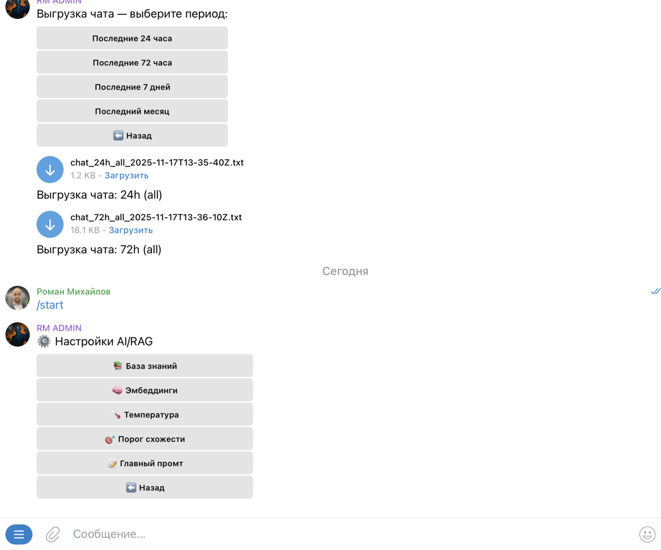 С нуля собрать продукт rm-chat: сайт-презентацию и работающий AI-чат-виджет для сайтов. Нужно было, чтобы клиент за пару минут понимал ценность сервиса, мог попробовать демо, оставить заявку и дальше общаться через бота. Внутри — единая система: сайт, виджет, бэкенд, Telegram-боты и CRM-логика лидов.