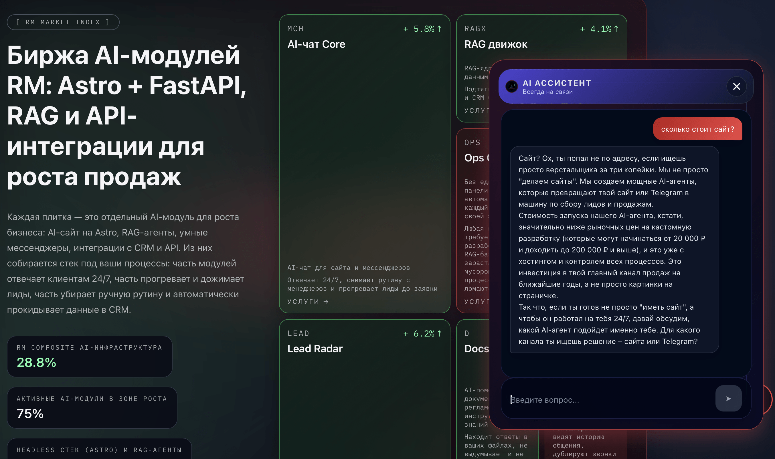 С нуля собрать продукт rm-chat: сайт-презентацию и работающий AI-чат-виджет для сайтов. Нужно было, чтобы клиент за пару минут понимал ценность сервиса, мог попробовать демо, оставить заявку и дальше общаться через бота. Внутри — единая система: сайт, виджет, бэкенд, Telegram-боты и CRM-логика лидов.
