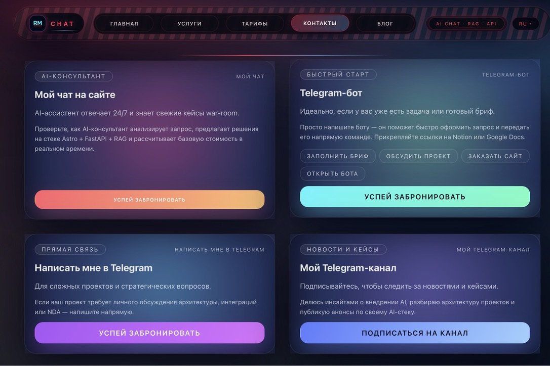 Важно было не просто “сверстать лендинг”, а собрать живой сервис, который сам генерит заявки. Сейчас проект показывает, как можно связать сайт, AI-чат и инфраструктуру вокруг него в одну цепочку — от первого визита до лида без ручных действий. Дальше есть поле для наращивания логики ассистента и интеграций под конкретных клиентов.