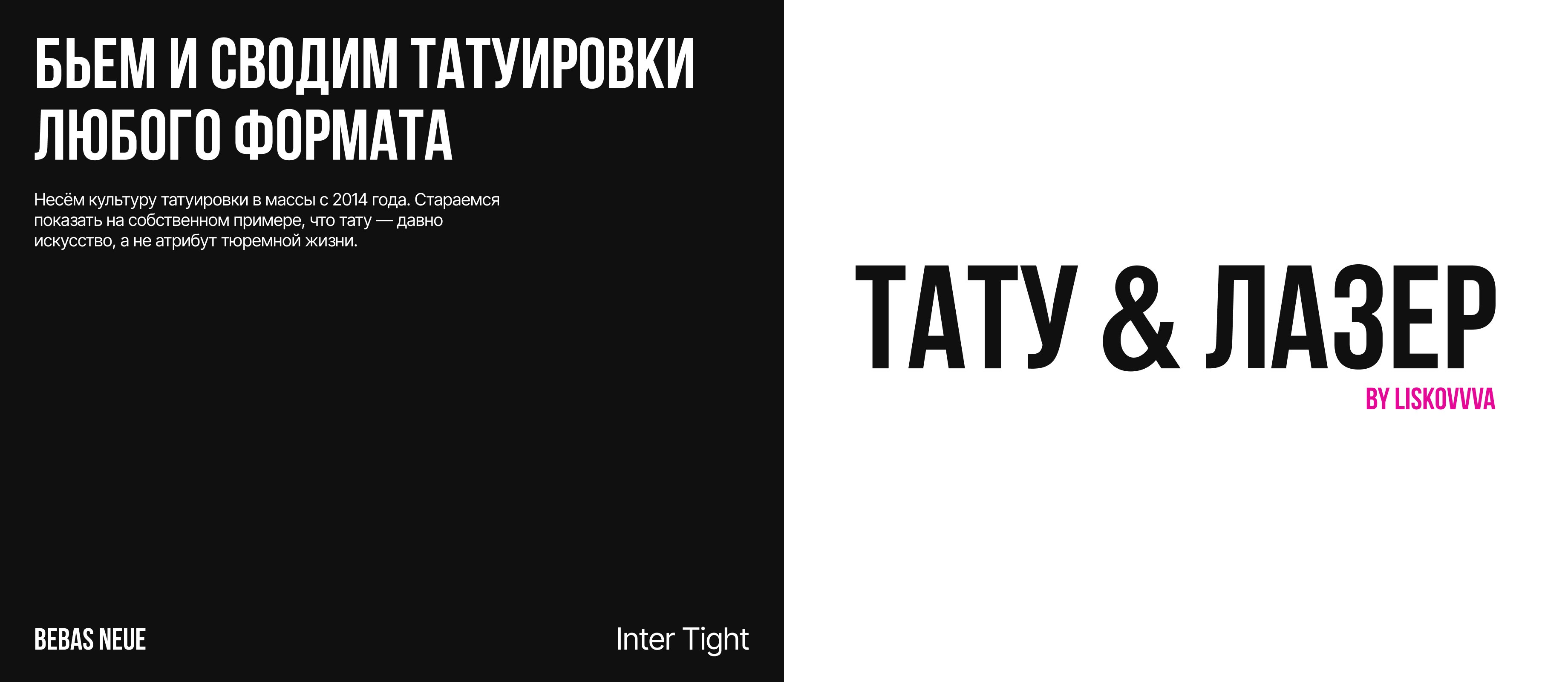 В дизайне использовали нестандартную сетку. Разделили экран посередине на две части и создали эффект зеркала за счет отражения элементов. Такой прием помог сохранить иерархию блоков на главном экране: банер с «набить тату» и «свести» остаются одинаково важными. На других блоках такой прием обеспечил баланс композиции между фото и текстом.