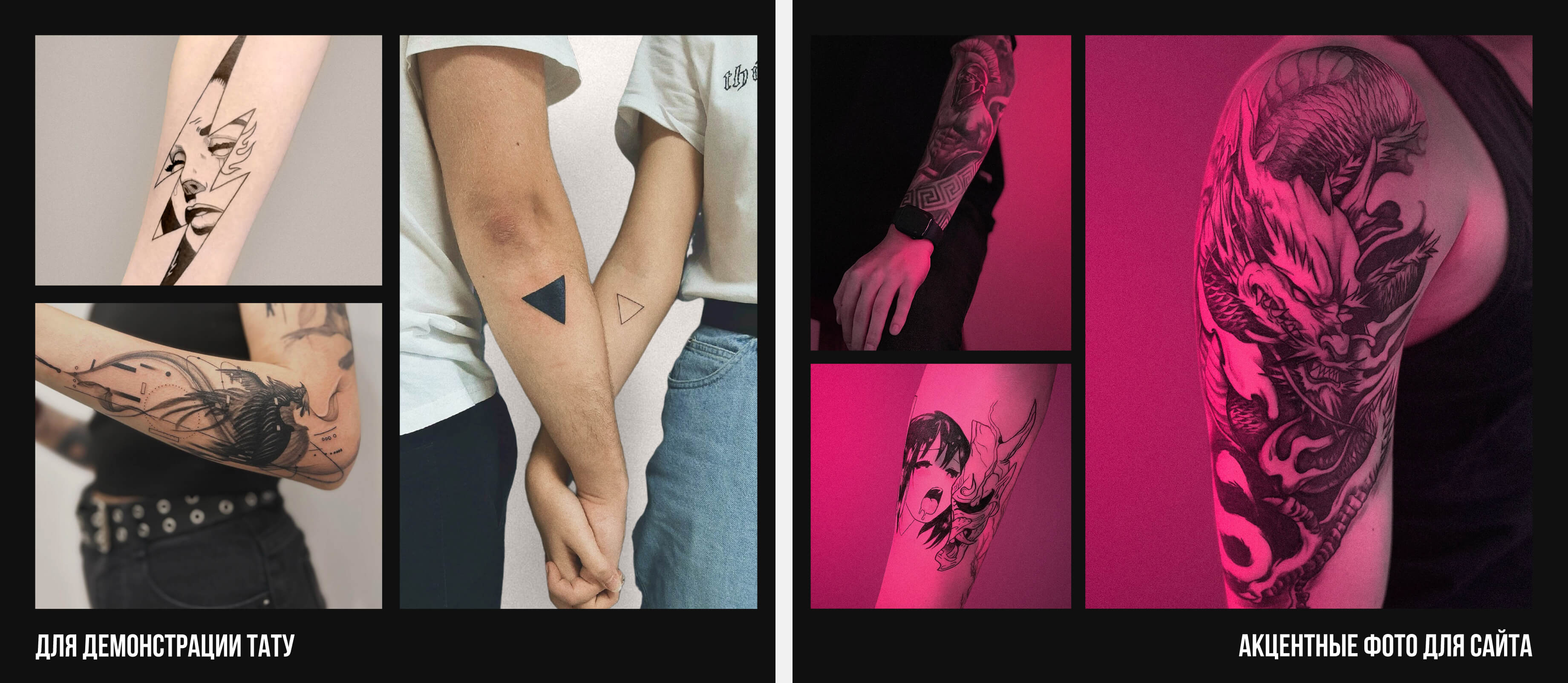 У студии было много фотографий работ, но большинство из них не вписывалось в дизайн сайта: разный фон, «грязная» кожа, непонятные объекты на заднем плане. Поэтому мы обработали большое количество фотографии. Добавили розовый свет, чтобы создать единство с фирменным стилем.