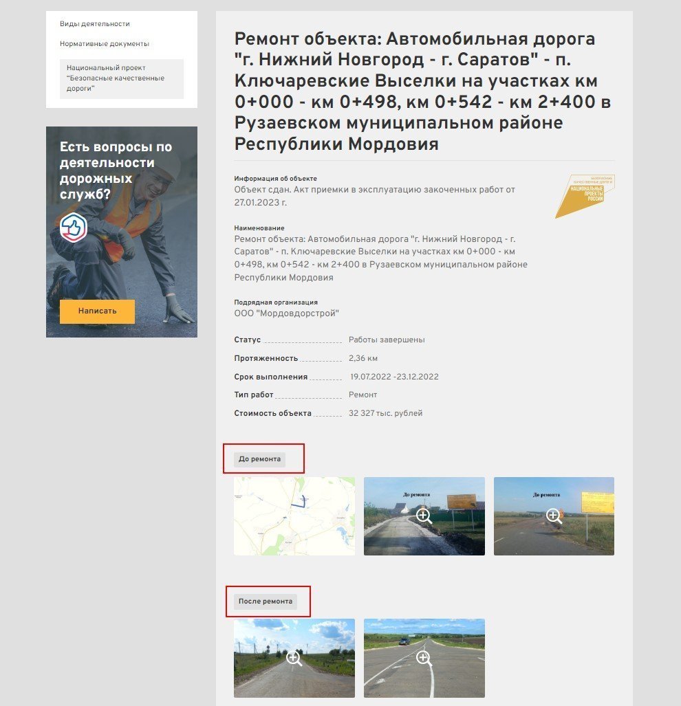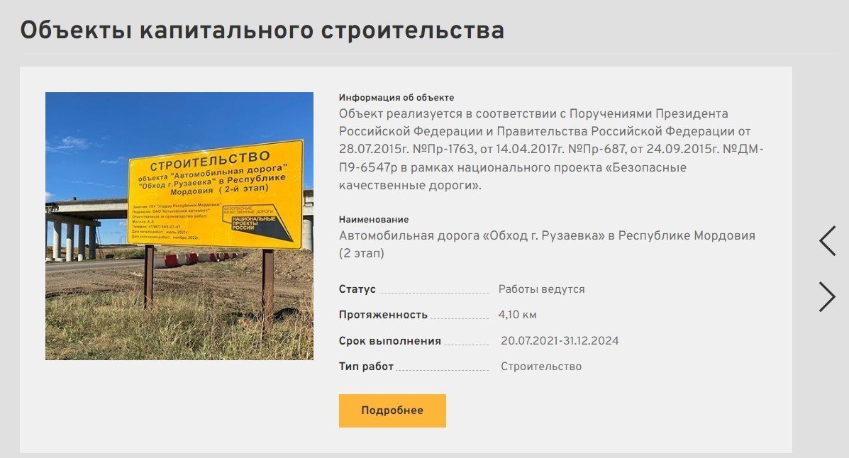 Нажав на кнопку «Подробнее», пользователь попадет в карточку объекта, где можно узнать больше информации, например, стоимость работ и наименование подрядчика.