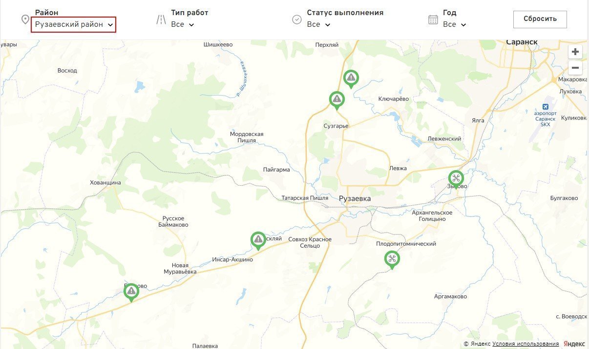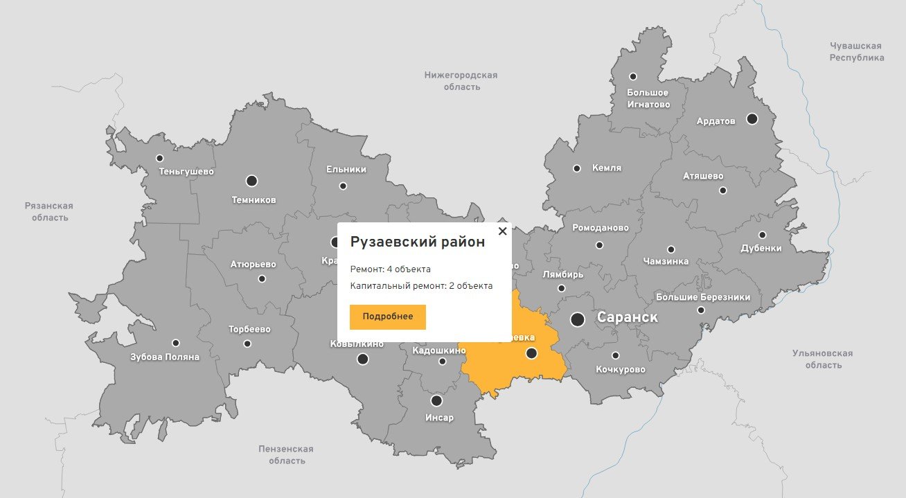 На главной странице тоже есть карта с выделенными границами районов республики. На ней выводится информация по типу работ и количеству объектов в каждом районе. При нажатии кнопки «Подробнее» пользователь переместится на интерактивную карту с выбранным районом.