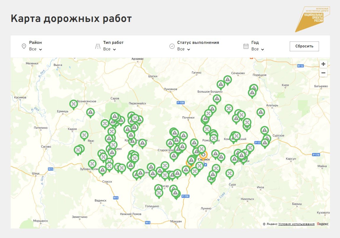 Каждая точка интерактивной карты задается вручную в админке. Также по каждой точке выбираются параметры, которые будут в фильтре, задается описание объекта и картинки. В зависимости от типа и статуса работ у точки выводится определенный значок.