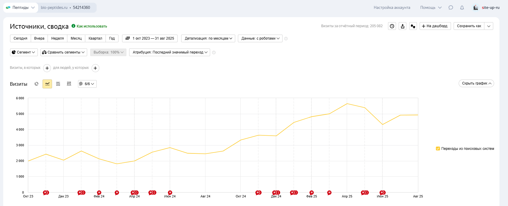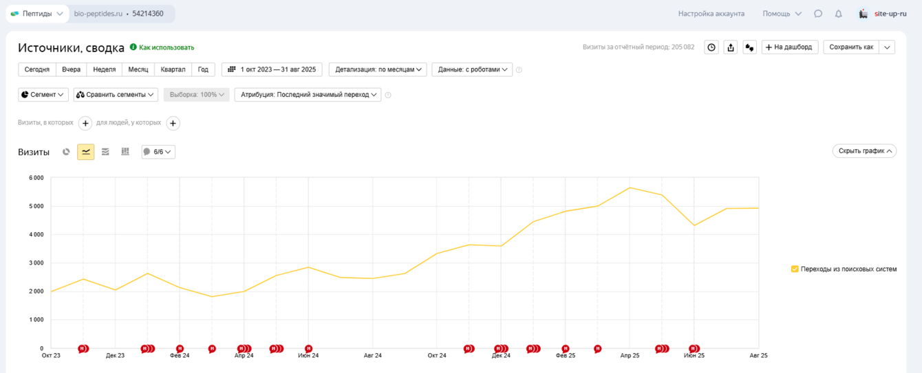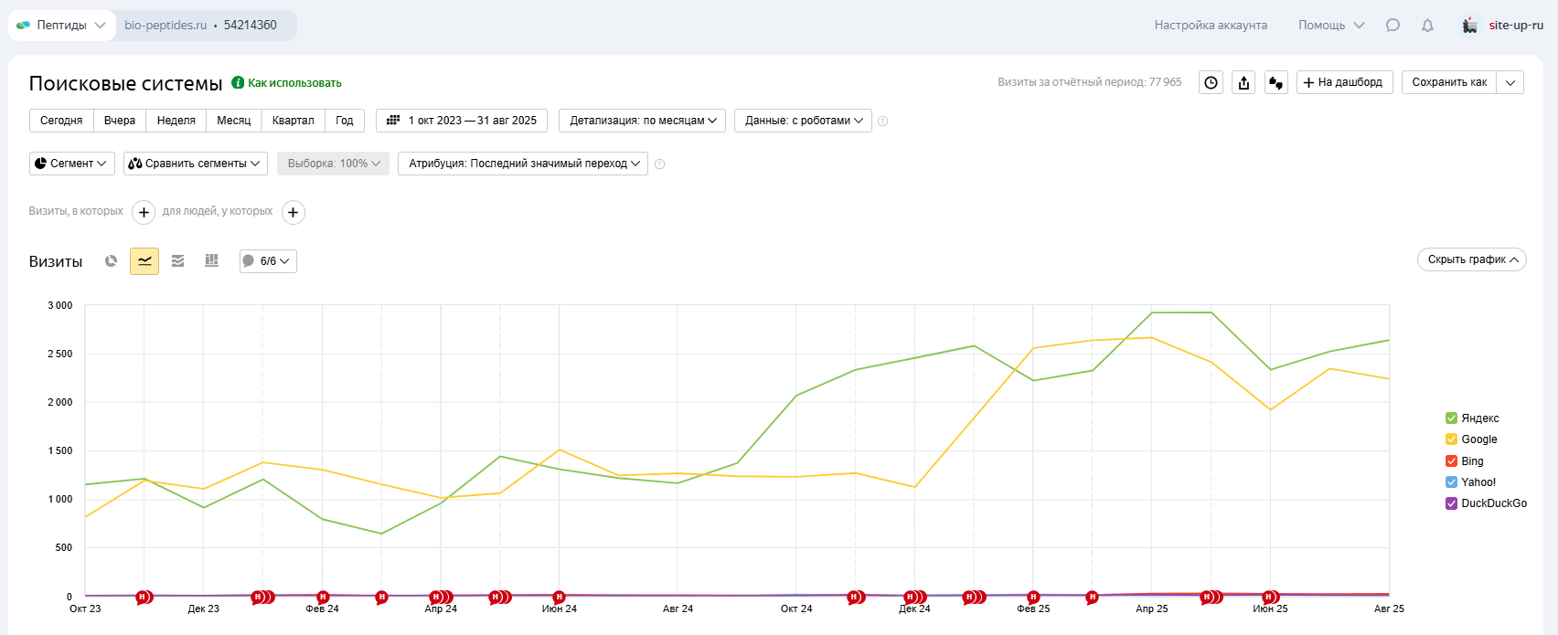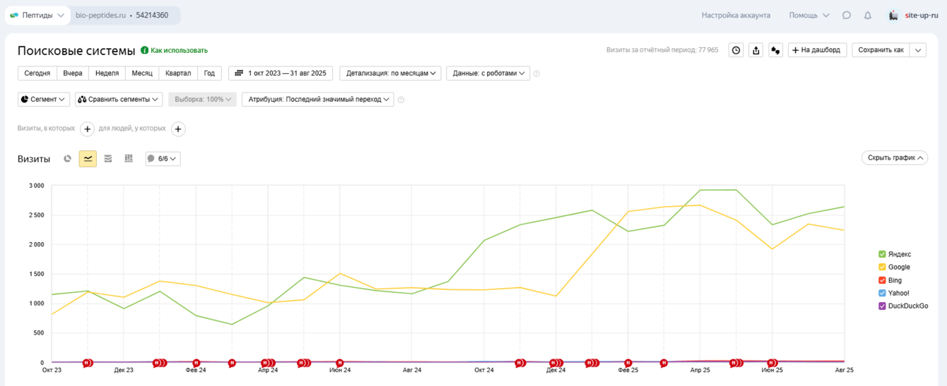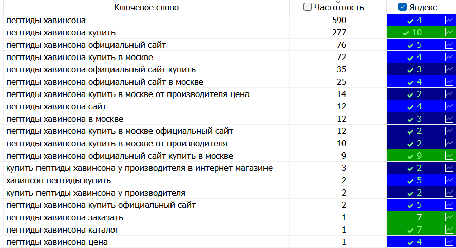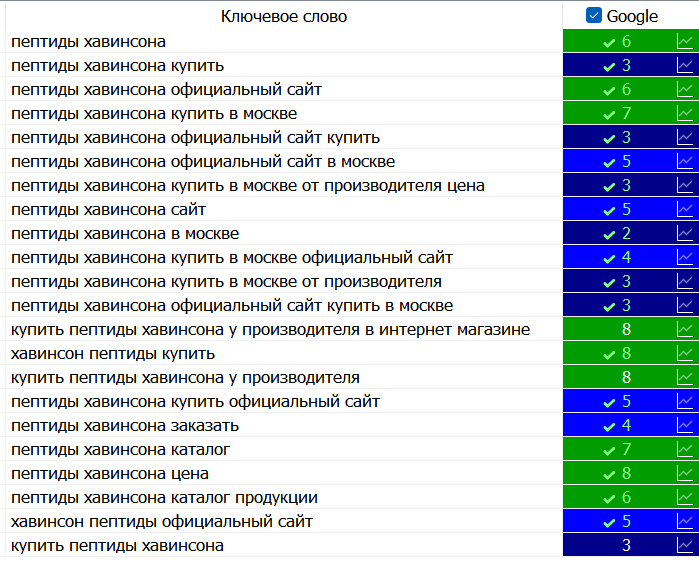 Продвижение сайта в Москве по запросам связанным с пептидами Хавинсона. Задача усложнялась наличием в топе агрегаторов.