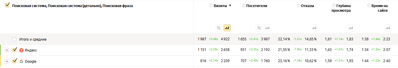 Важно также отметить, что вырос не только трафик более чем в 2 раз, но и его качество. Отказы в Яндекс уменьшились почти в 2 раза (с 21,55% до 11,33), выросли глубина просмотра и время проведенное на сайте. Т.е. сайт не только стал привлекать больше трафика, но и вызывает больший интерес у пользователей поисковых систем.