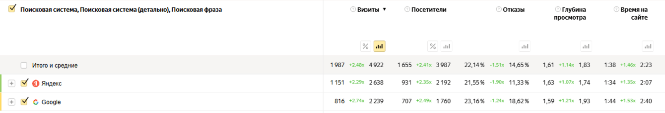 Общая посещаемость из поиска выроста с 1987 до 4922, на пике, который пришелся на апрель - более 5600.