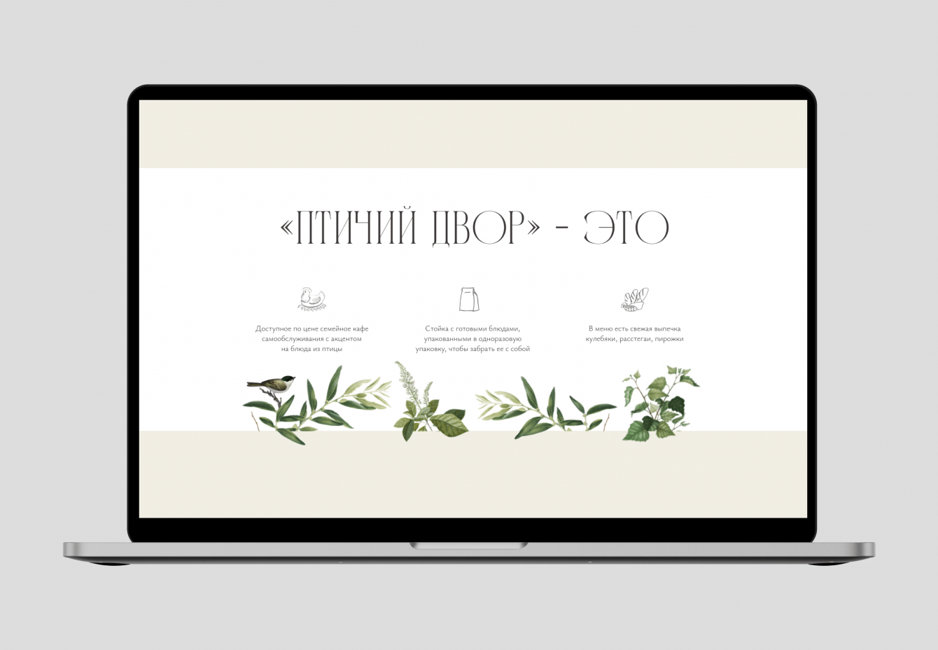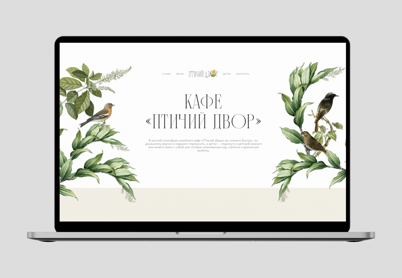 Мы делали сайт к открытию семейного кафе, поэтому после создания сайта у жителей и гостей Ростова Великого появилась возможность легко найти основную информацию о кафе (историю, позиционирование, меню, часы работы, местоположение и тд). А анимации с листьями и звуки пения птиц на сайте позволяют посетителям сайта окунуться в атмосферу «Птичьего Двора», даже если они ещё не были в заведении.