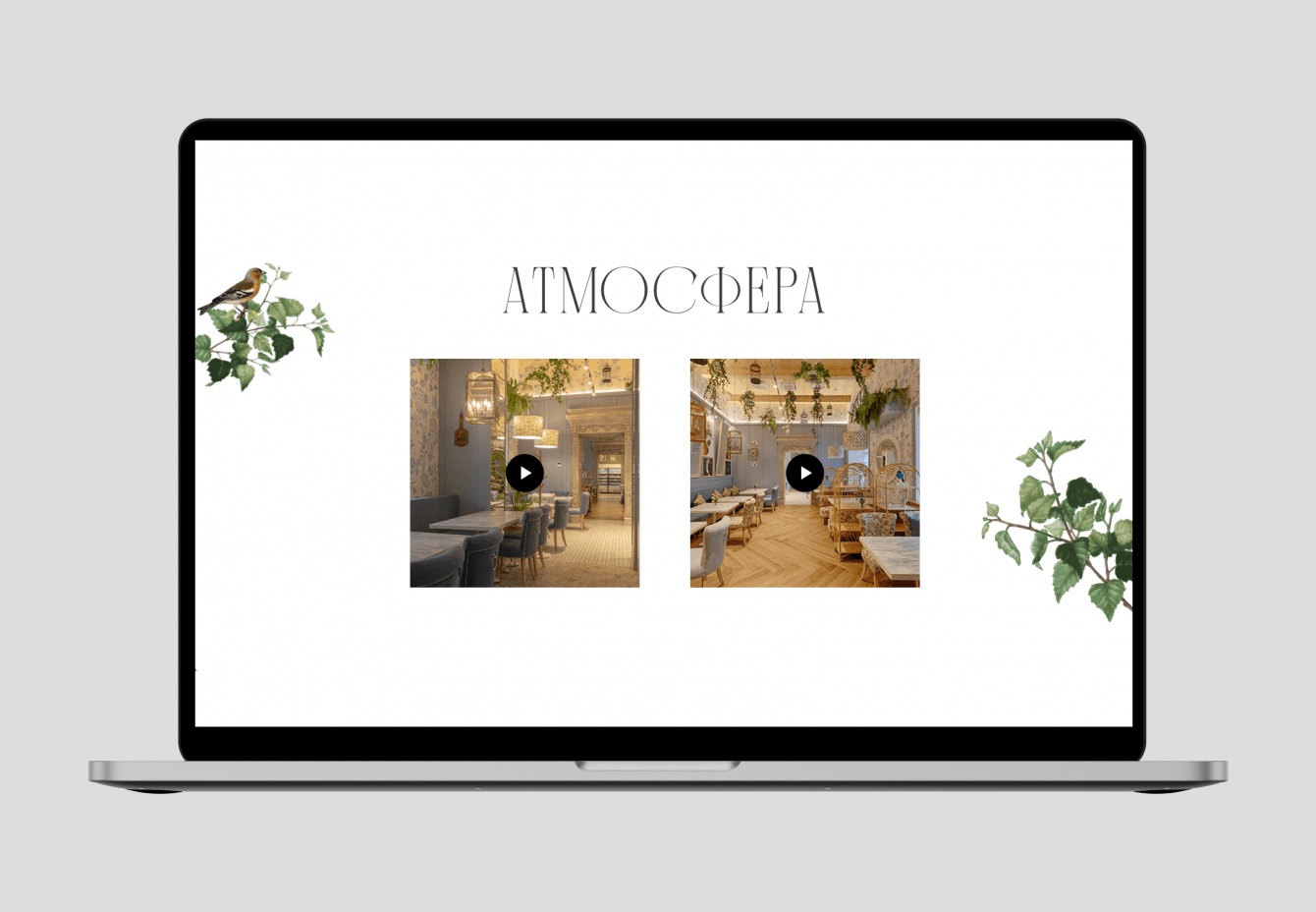 - визуально погружает в атмосферу кафе не только с помощью фотографий интерьера, но и с помощью дизайна и анимации на лендинге: листья, на которых сидят птицы, качаются, а пользователи могут насладиться звуками их пения.