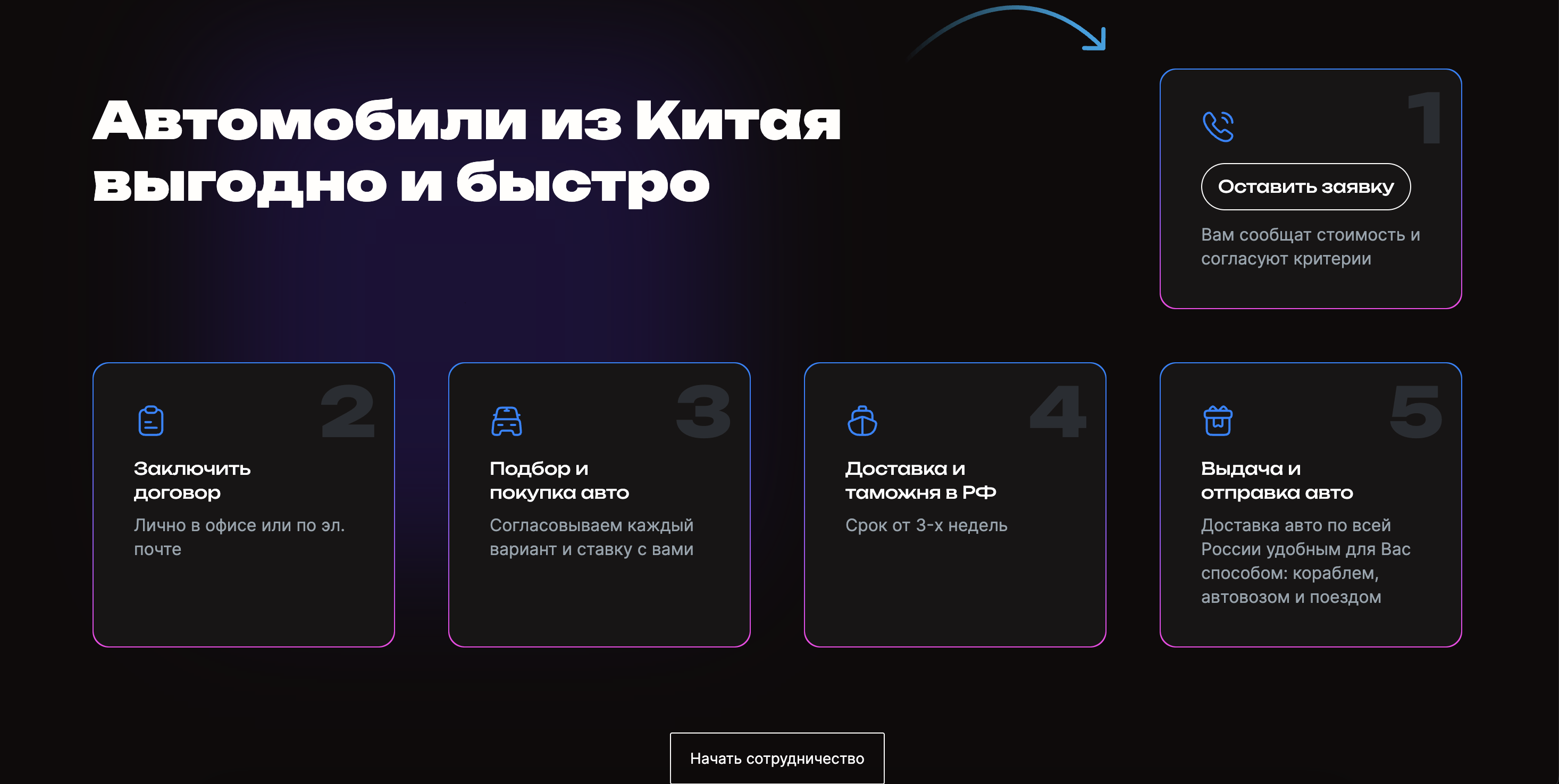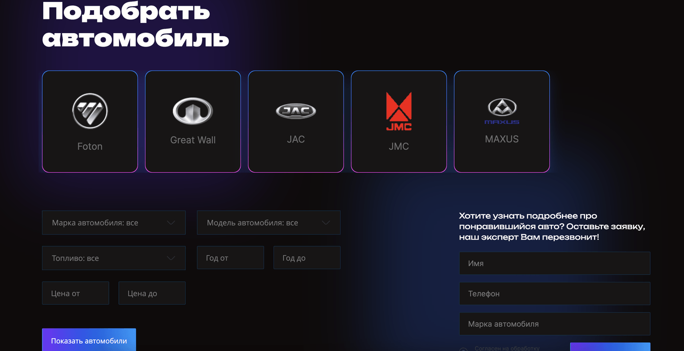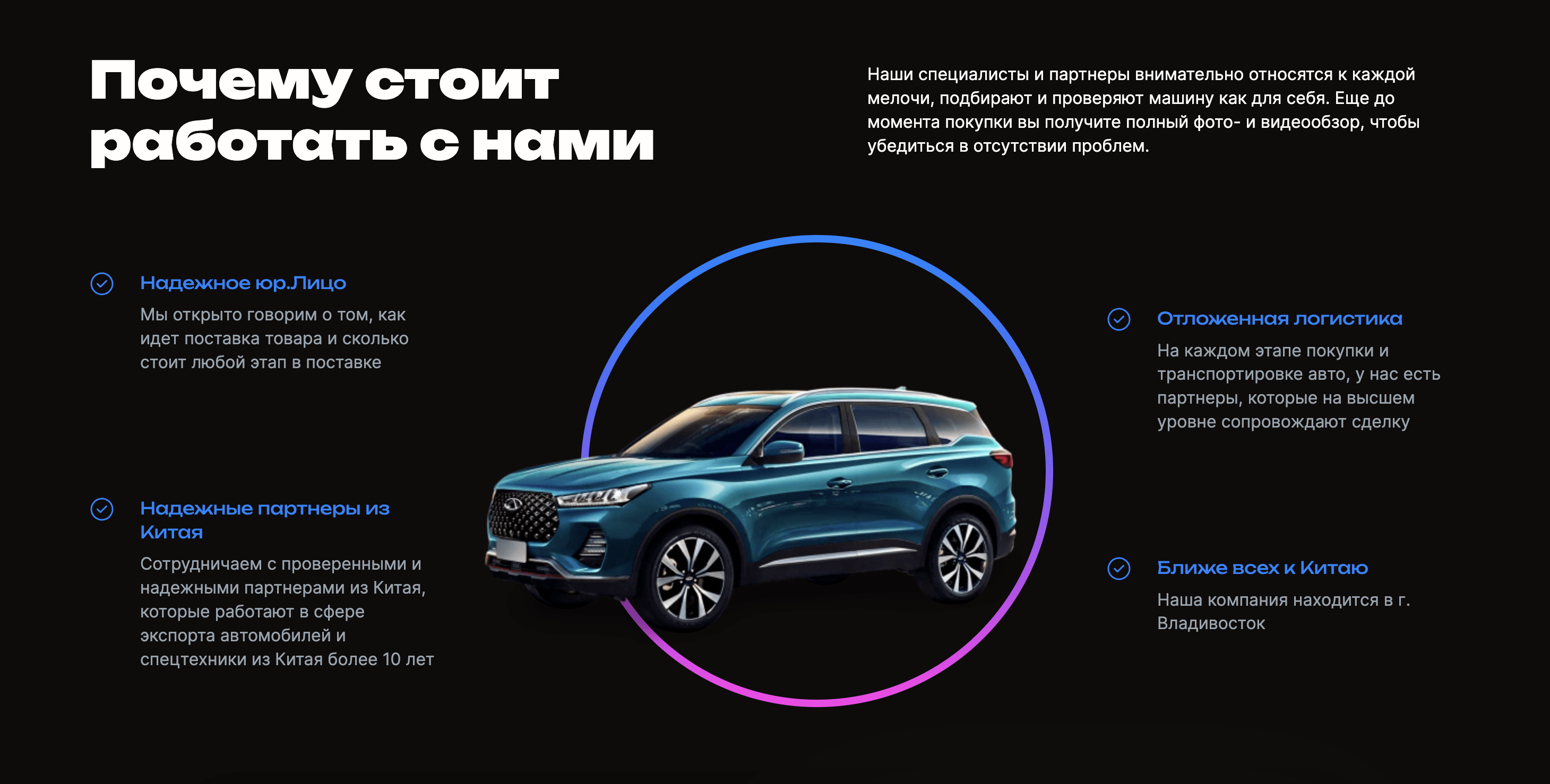 Создать современный и доверительный веб-ресурс, демонстрирующий комплекс услуг: подбор, покупка, доставка и юридическое оформление авто.