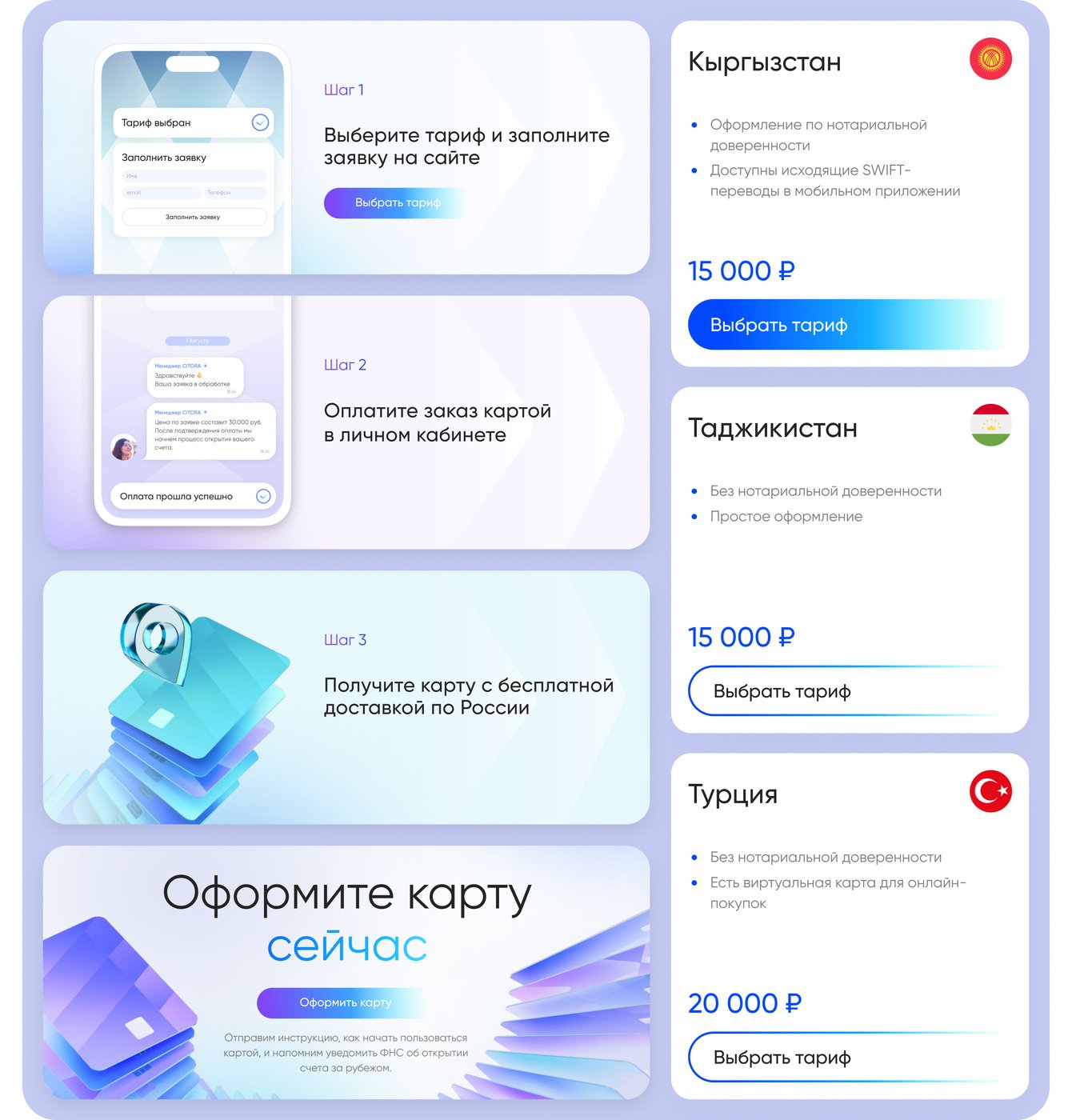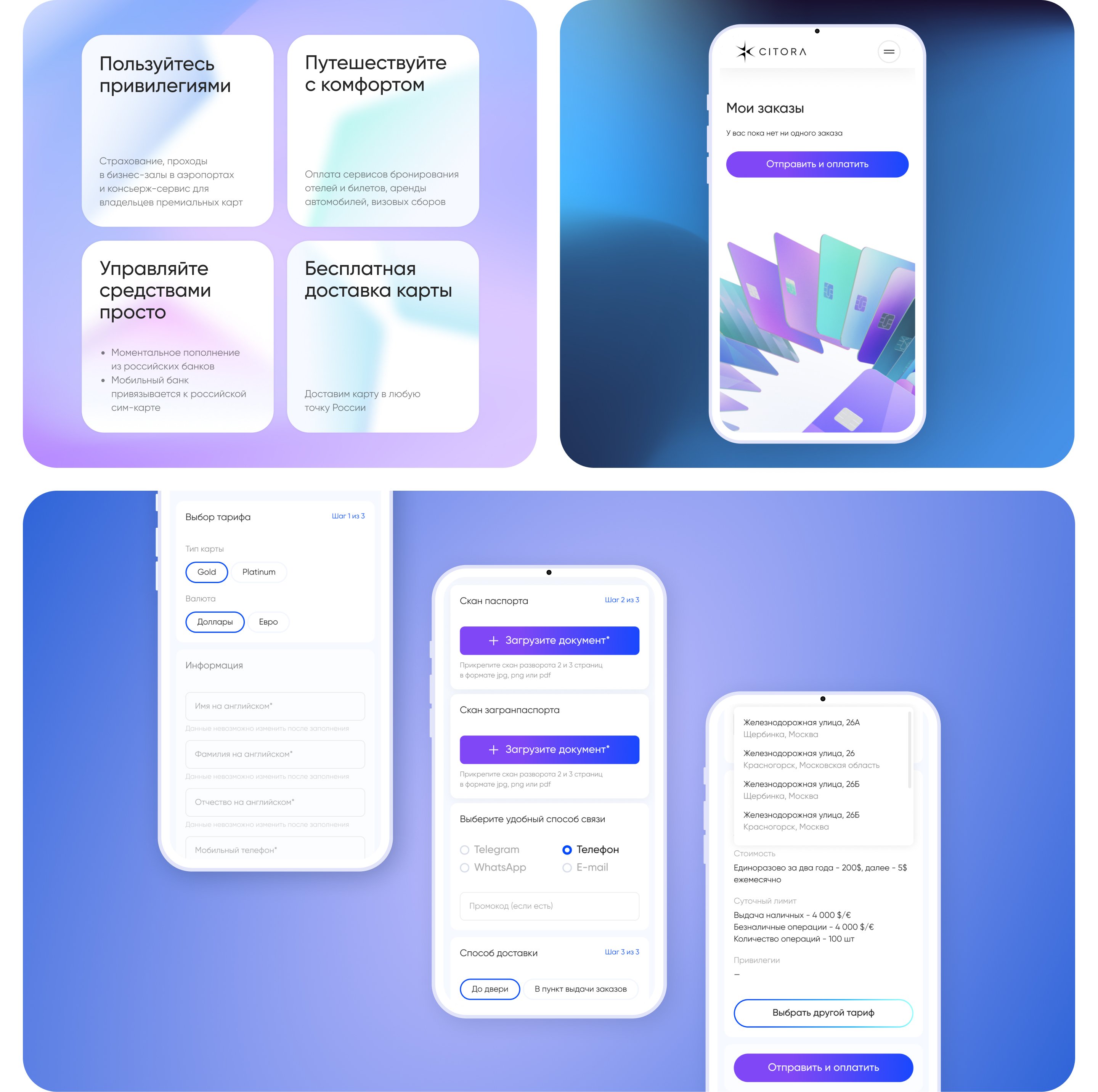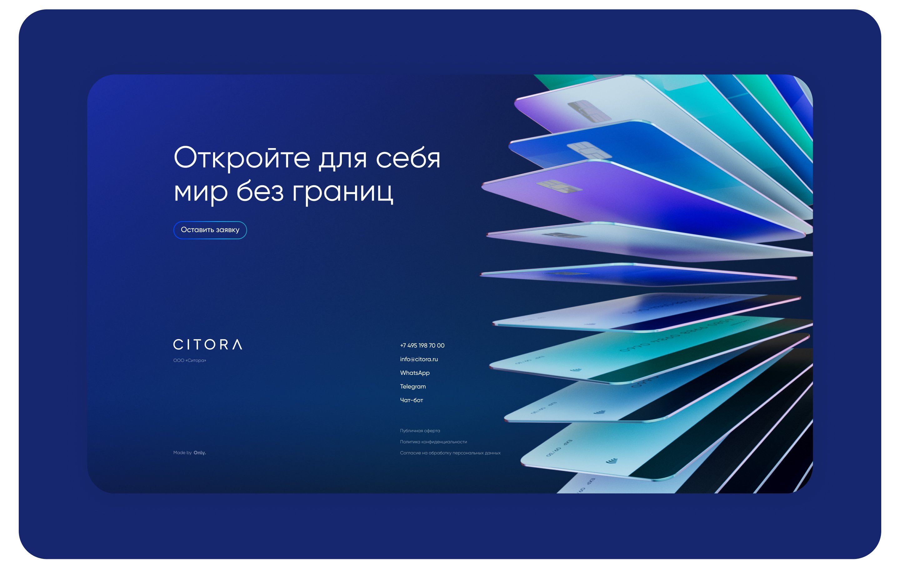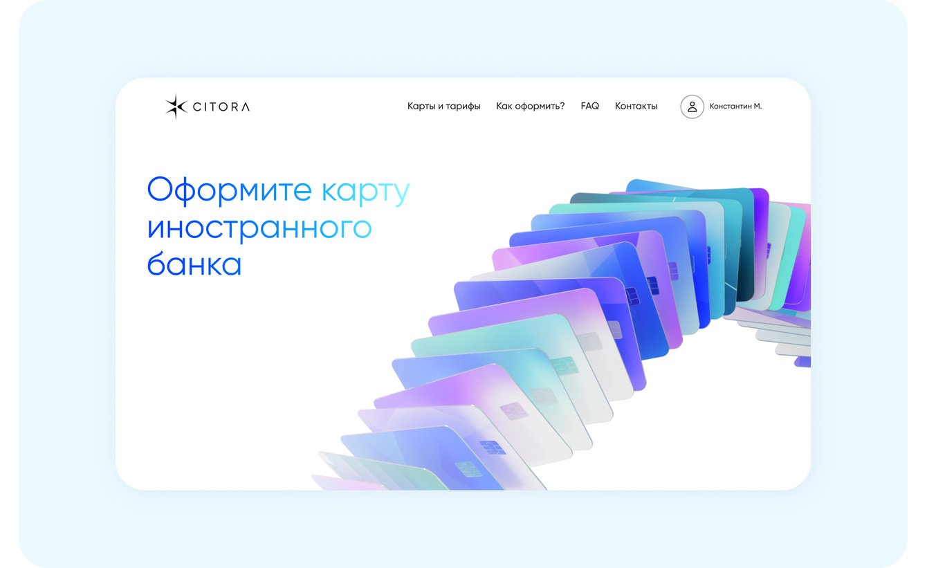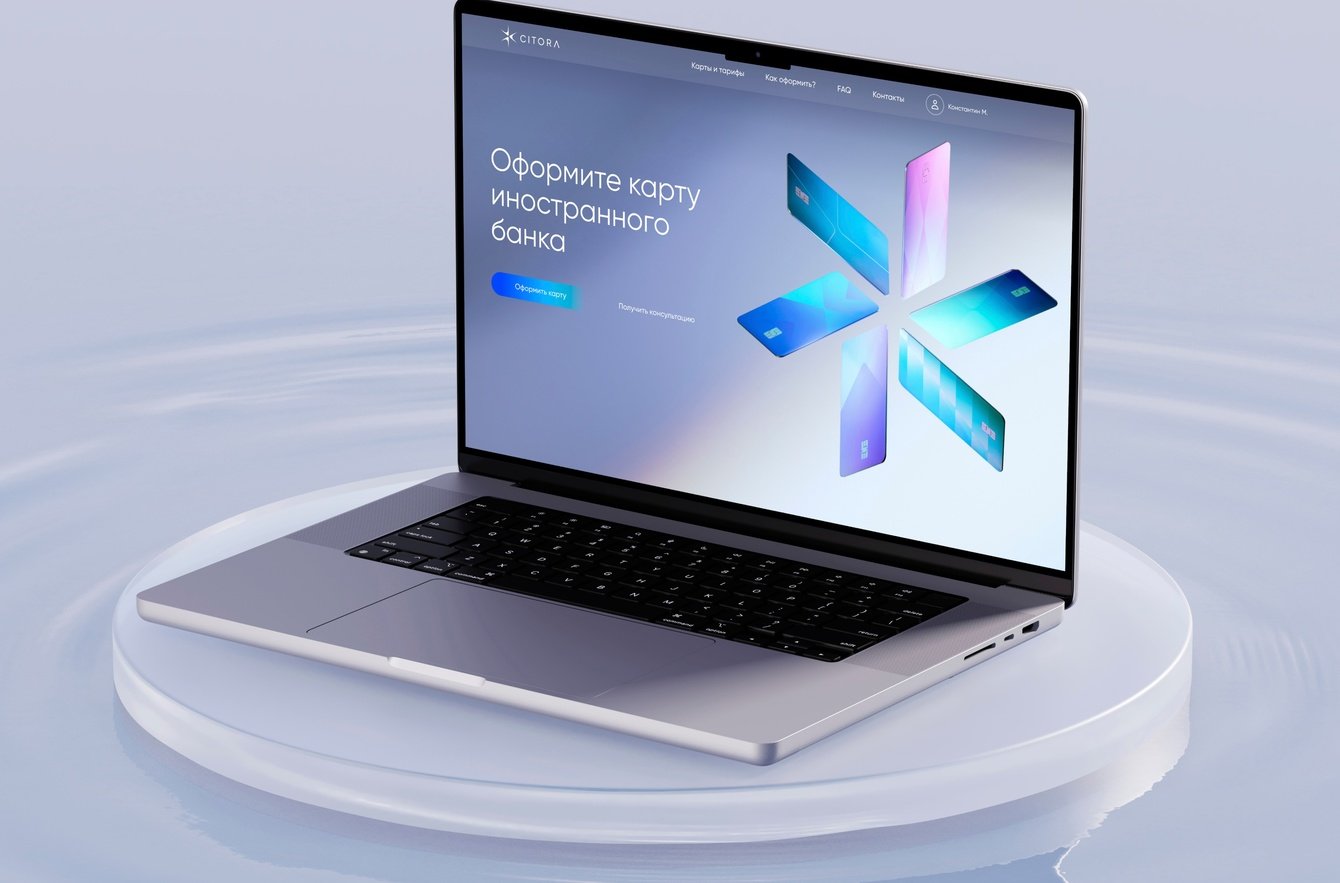 Компания «Ситора», премиальный сервис по открытию иностранных карт и счетов, обратилась к нам за созданием корпоральной айдентики и запуском сервисного промосайта. Перед нами стояла задача не просто сделать еще один сайт, а создать целостный образ бренда, который позволил бы «Ситоре» выгодно выделиться и транслировать ценности премиальности и технологичности.