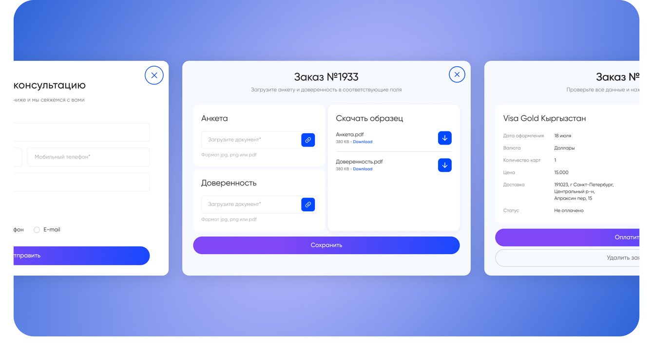 В процессе работы мы обновили логотип, подготовили брендбук и запустили сайт с возможностью оформления заявок на открытие иностранной банковской карты с последующим отслеживанием статуса заявки в личном кабинете.