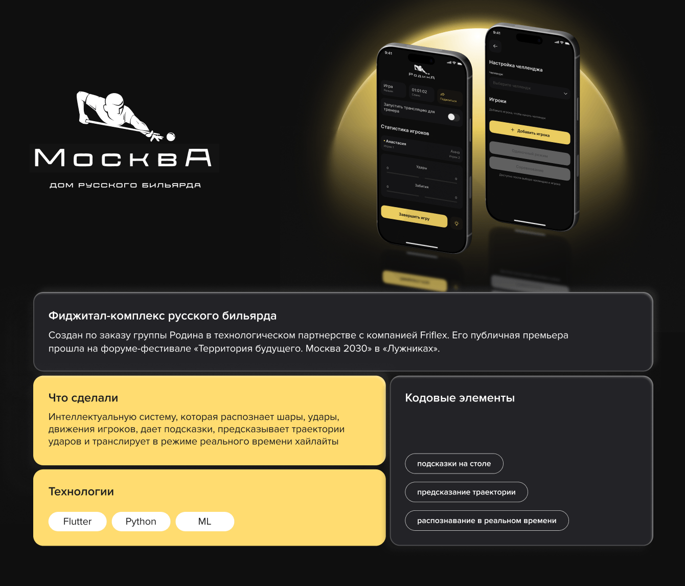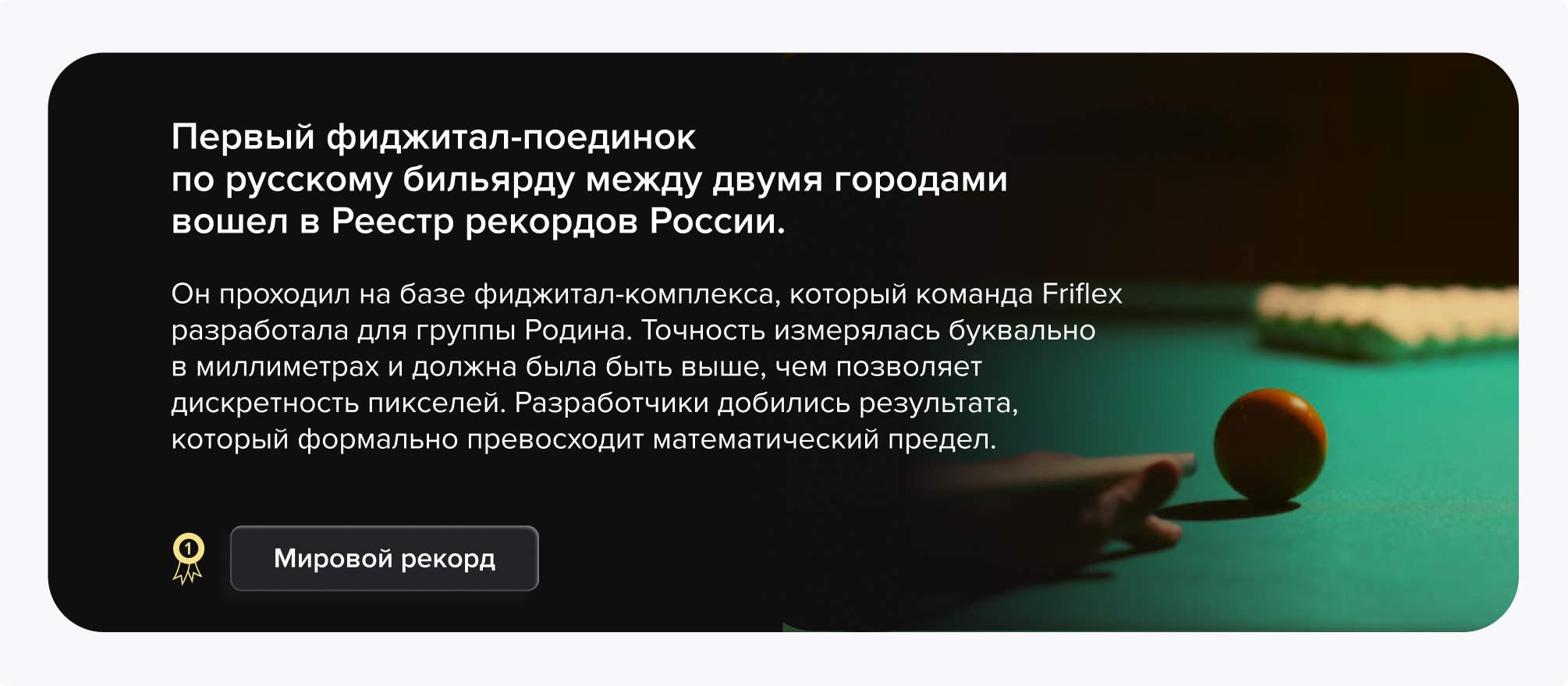 Глобальная цель проекта — формировать и поддерживать тренд на русский бильярд. Команда Friflex как технологический партнер группы Родина взяла на себя реализацию фиджитал-комплекса для этой игры.