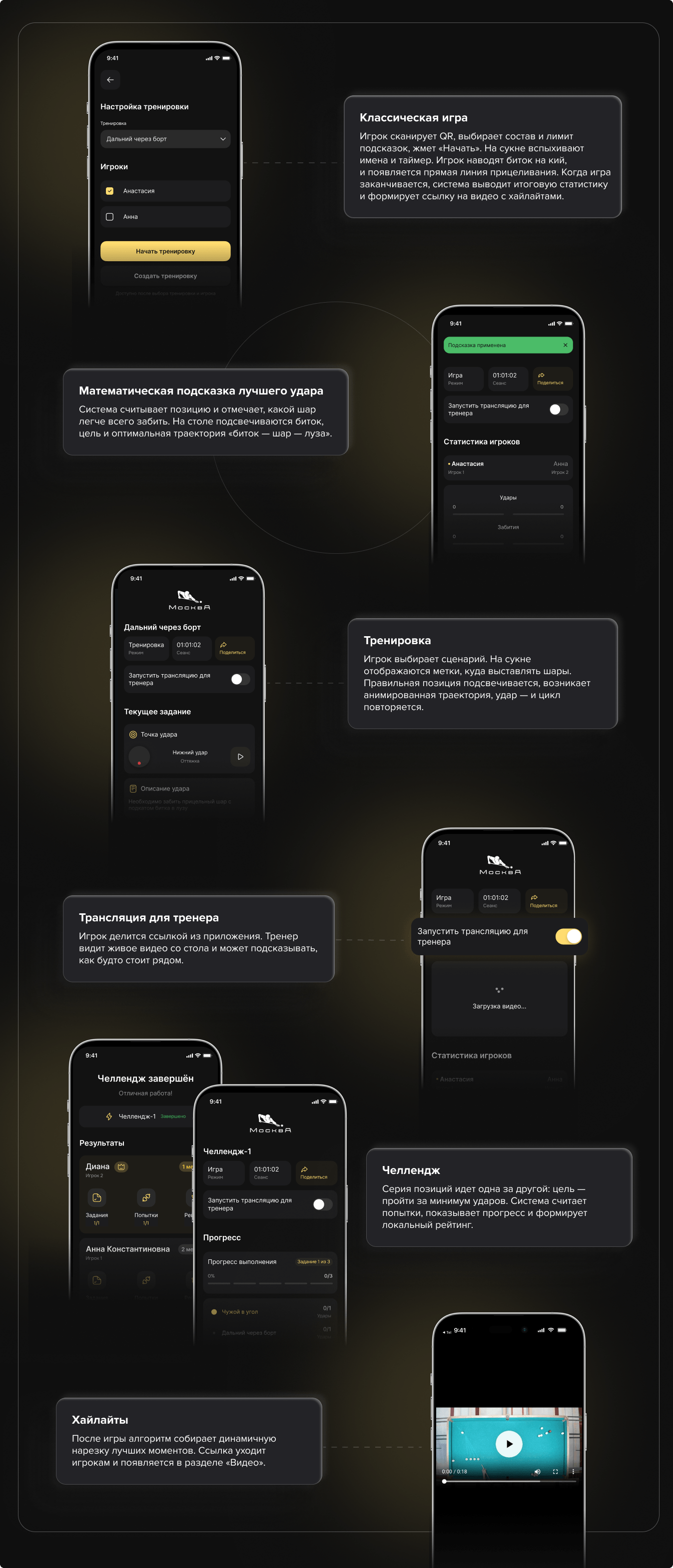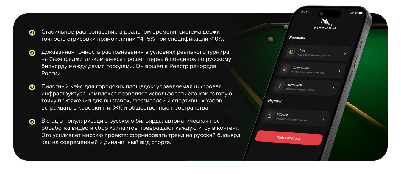В бильярде команда решала похожую задачу: превращала классический офлайн-спорт в цифровой продукт с подсказками, продвинутой аналитикой, трансляциями и контентом для соцсетей.