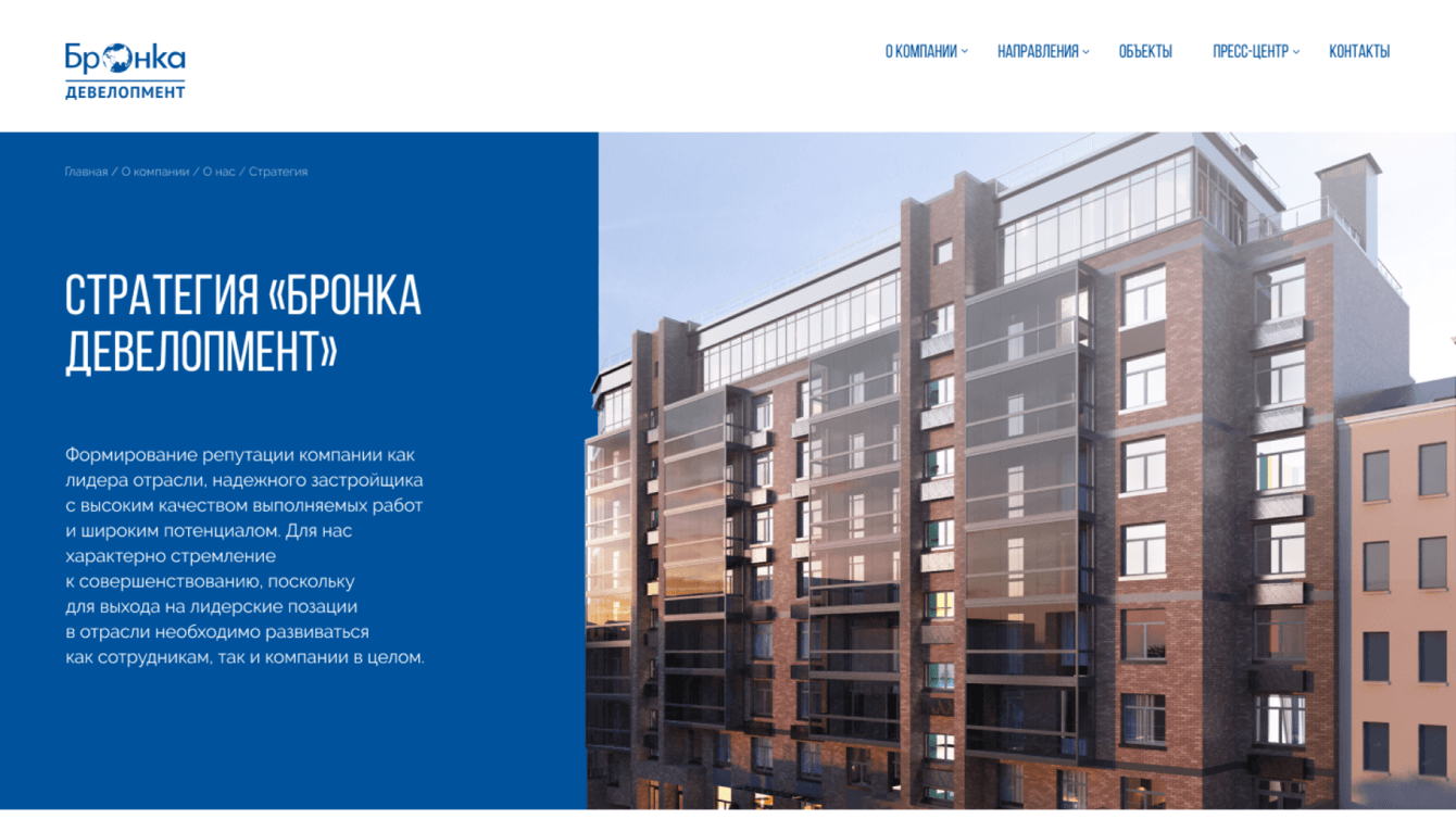 Девелопер обратился к нам за разработкой сайта. В ходе предпроектной аналитики мы выяснили основные потребности клиента: создать имиджевый сайт для формирования лояльности к бренду, рассказать о компании и ее проектах, сформировать образ надежного, устойчивого застройщика, простимулировать непрямую продажу жилой недвижимости и аренду коммерческой недвижимости посредством первичного контакта через сайт.