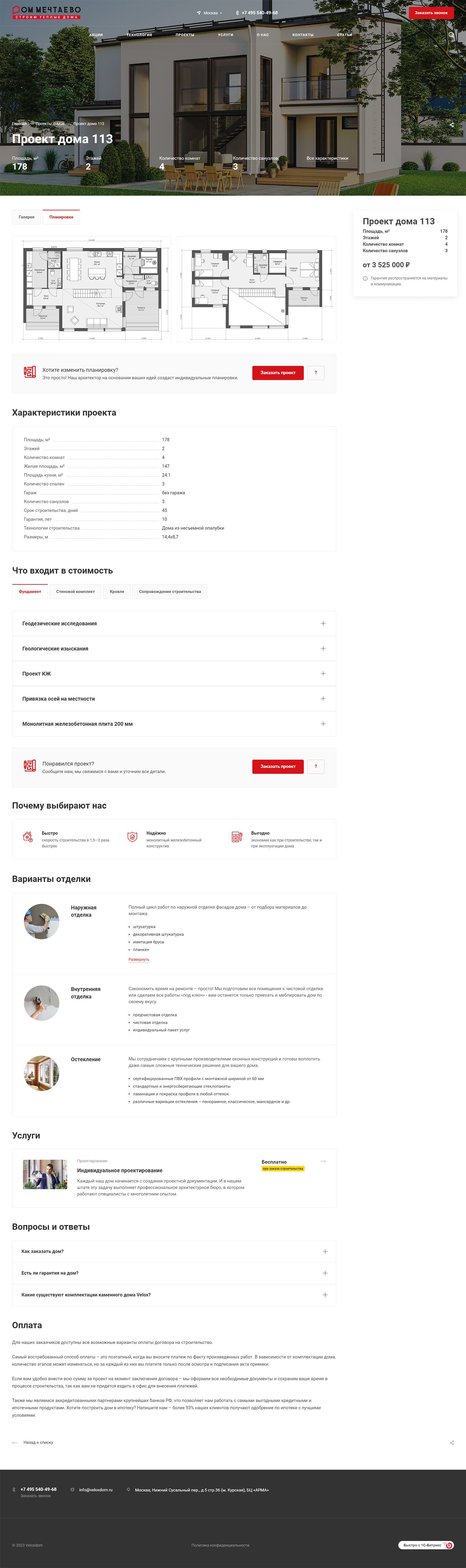 — наполнение каталога карточками проектов с подробными описаниями: планировки, характеристики, варианты комплектаций, визуализации, стоимость и сопутствующие услуги;