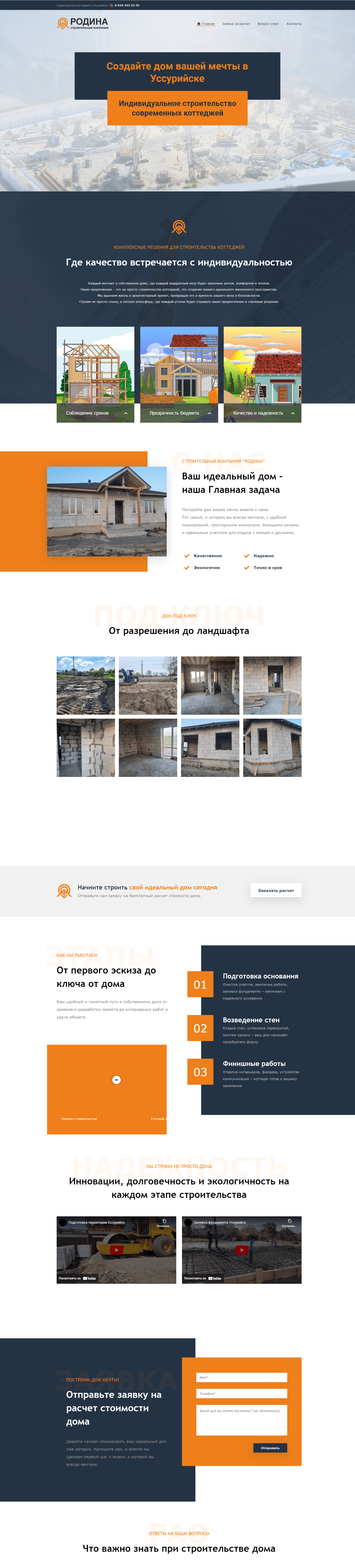 Дизайн был продуман с учётом фирменного стиля компании. Ярко оранжевый цвет, который является основным в бренде “Родина”, был гармонично использован на сайте, а пространство между элементами оставлено для лёгкости восприятия. Мы также позаботились о том, чтобы сайт был максимально удобен для мобильных устройств и легко загружался, что стало важным с точки зрения SEO.