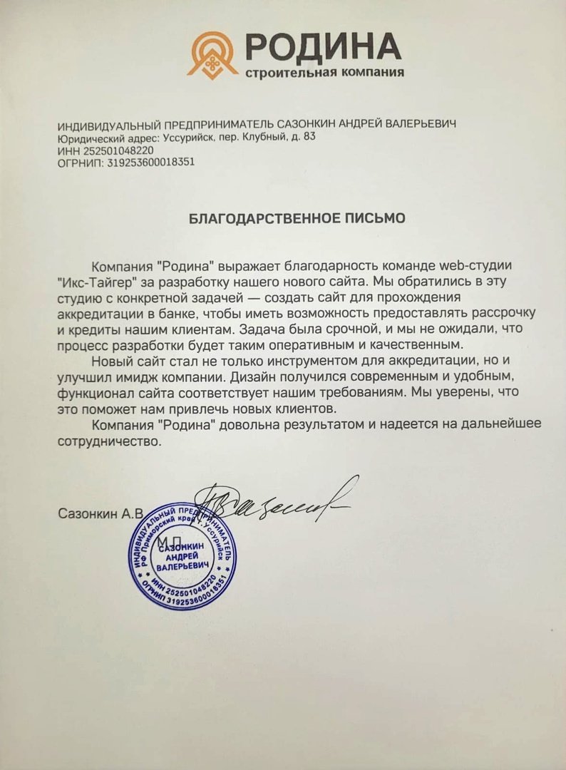 Создание лендинга для компании “Родина” стало успешным шагом к решению множества задач. Мы не только помогли компании пройти аккредитацию в банке, но и значительно улучшили её онлайн-имидж.