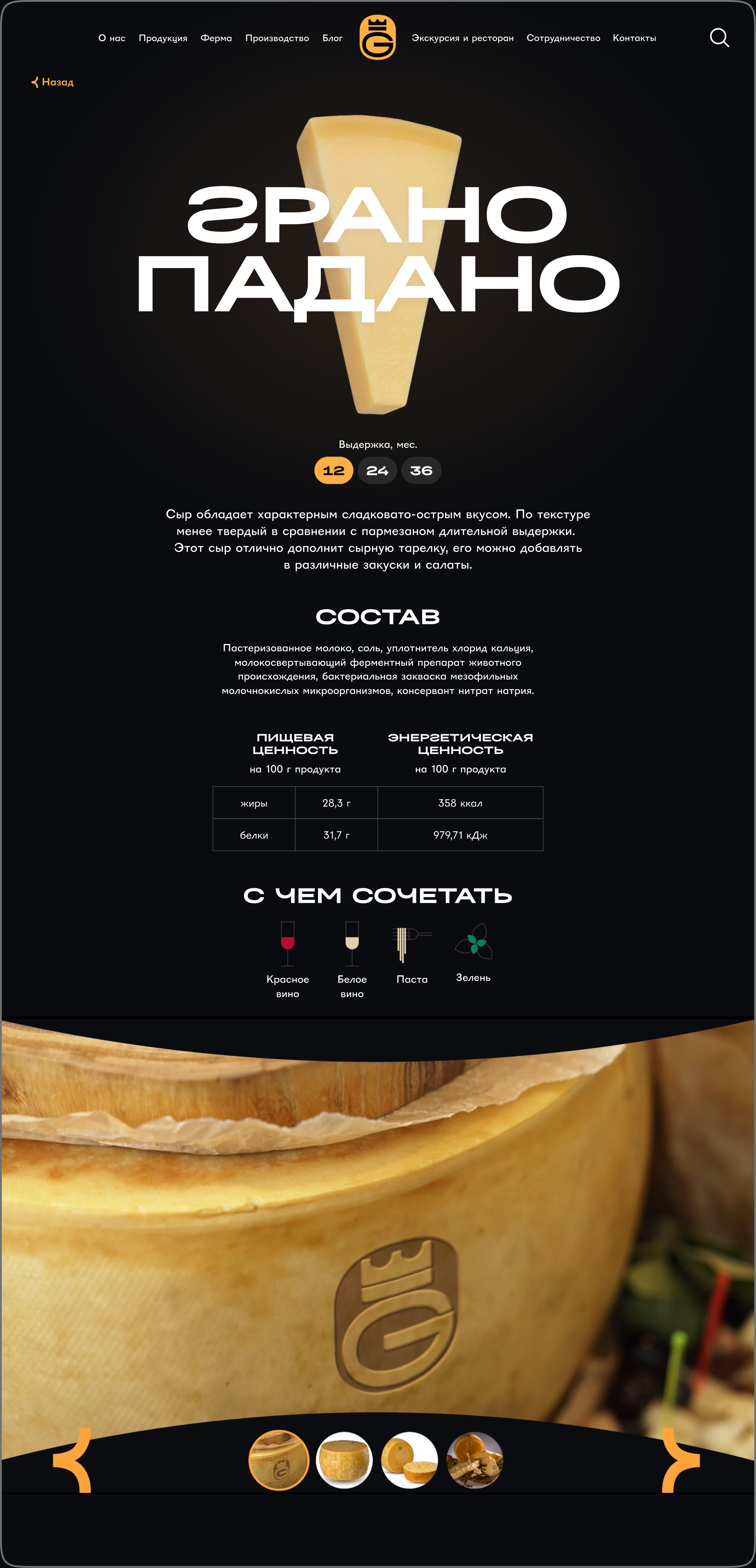 «Гран рэ» — екатеринбургская сыроварня с собственной молочной фермой, которая работает уже тридцать лет. Главный продукт компании — одноименный пармезан, и отличается он от итальянского прародителя только названием. Мы задизайнили сайт, который погружает и влюбляет в культуру натуральных качественных сыров.