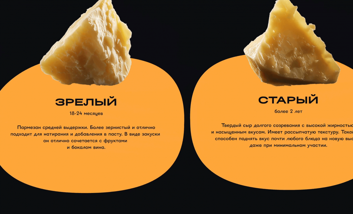 Компания не боится показывать, что сыр создается в России. Дух отечественного производства поддерживает визуализация пармезана в виде Уральских гор. Образ задает внушительный и торжественный тон.