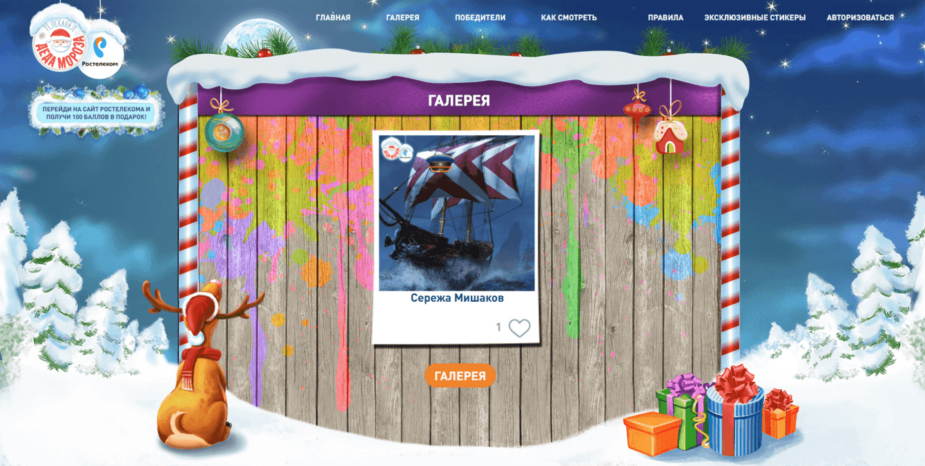Разработали фоторедактор для создания новогоднего фото и раздел галереи для определения лучших конкурсных работ через голосование. Реализовали возможность шеринга в соцсетях.