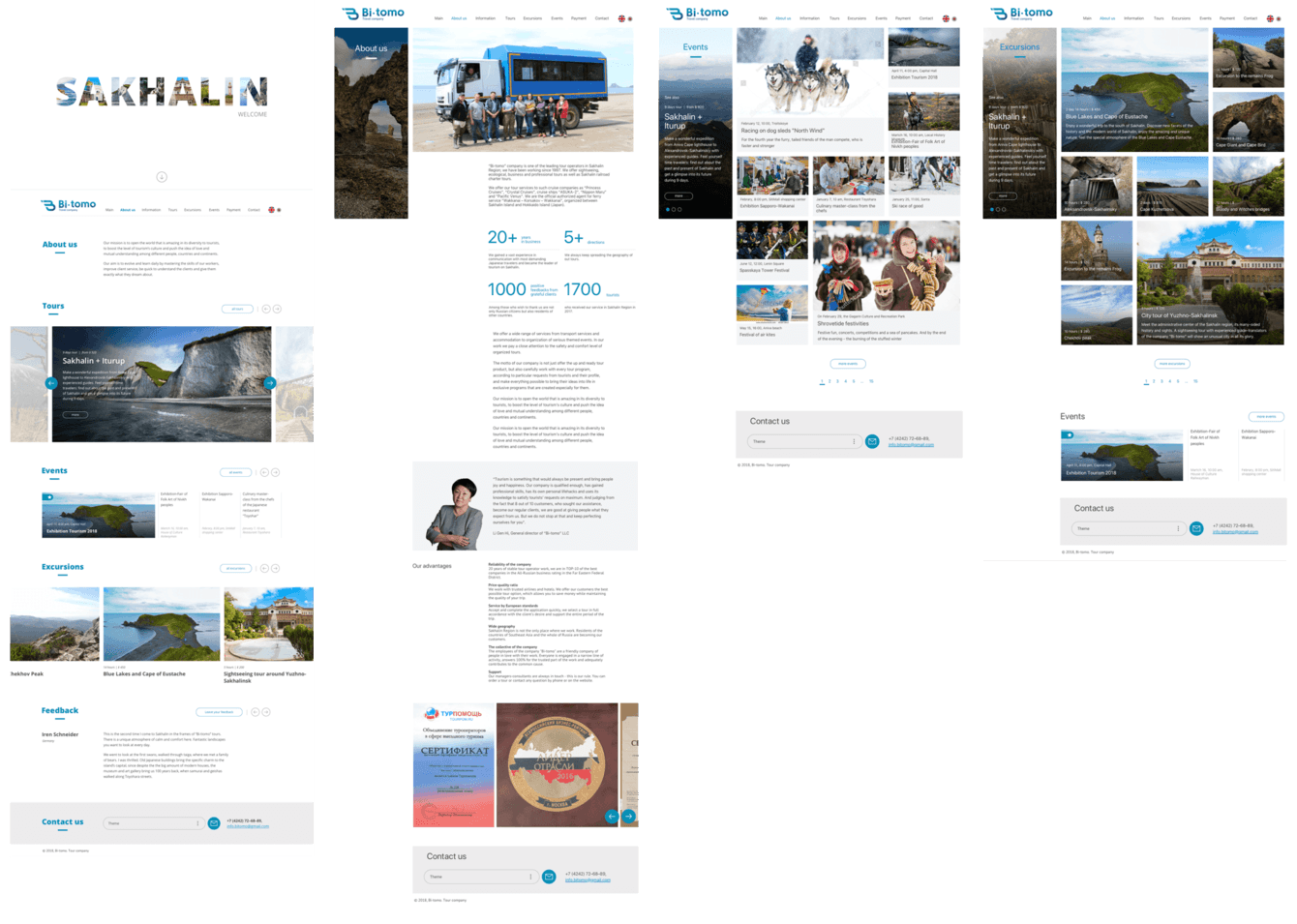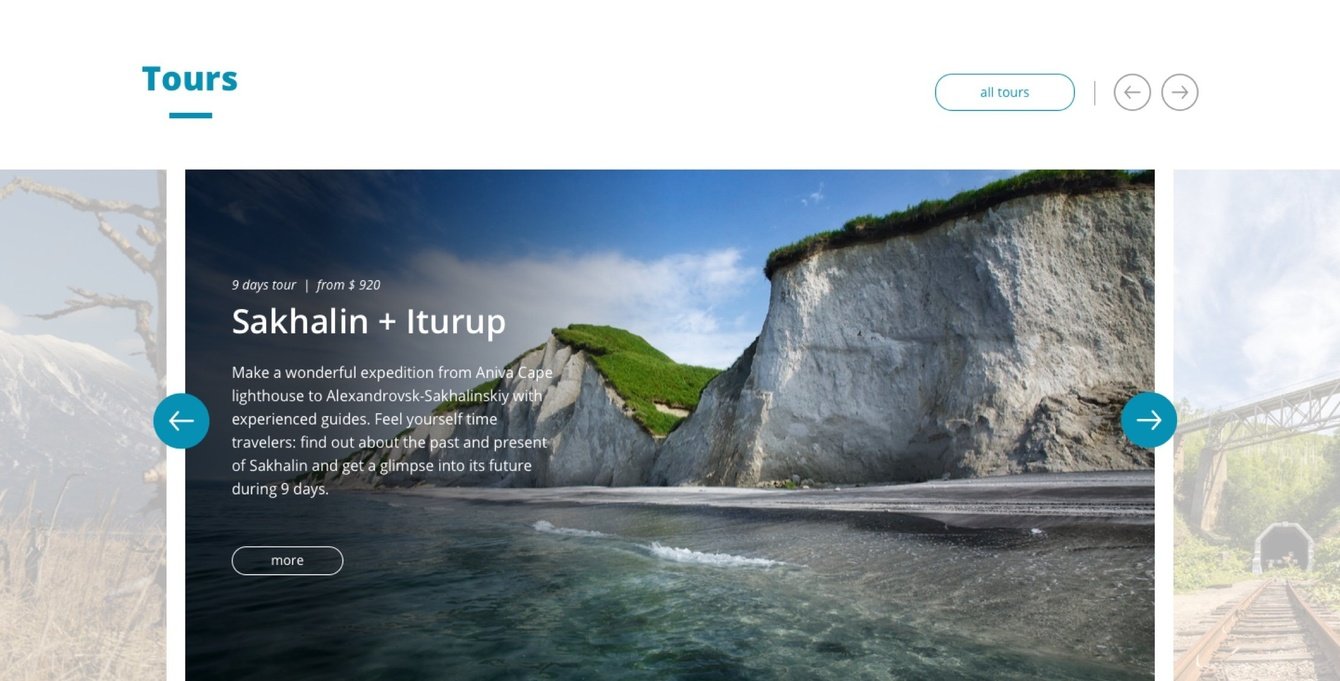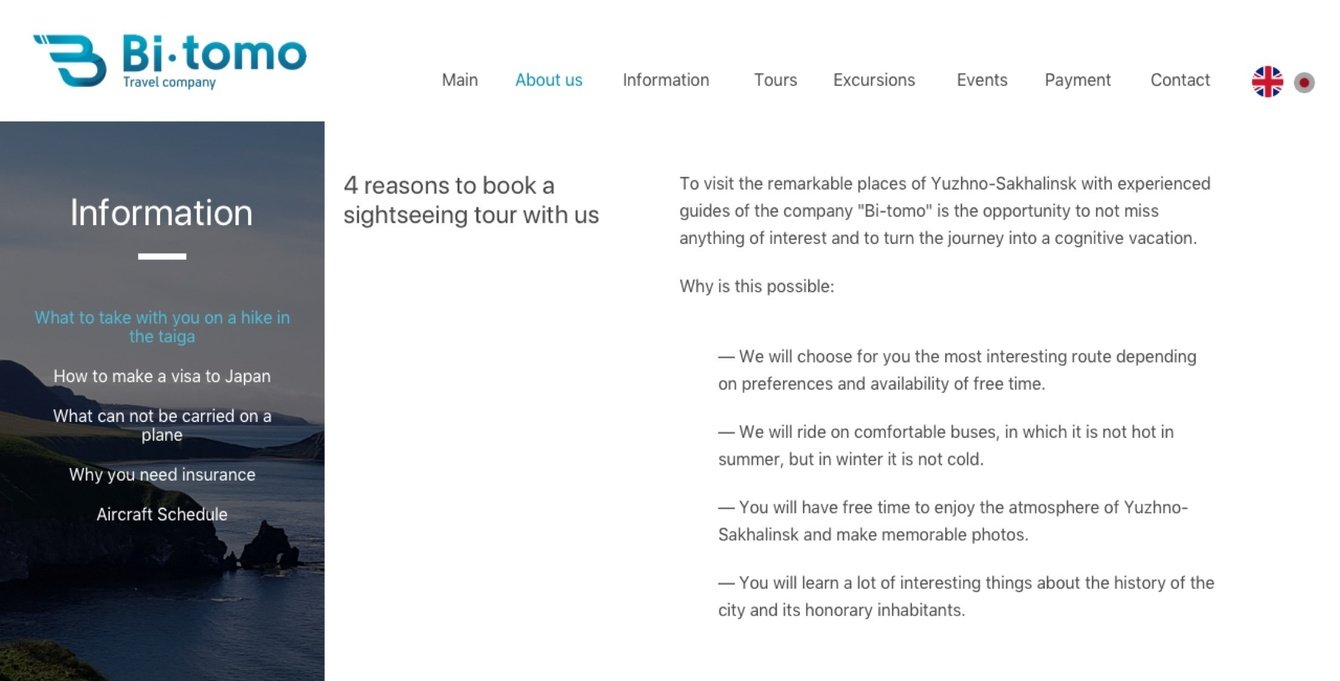 Разработать сайт туристической компании, ориентированный как на граждан РФ, так и на англоговорящую и японоговорящую аудиторию. Из главных просьб — очень просили визуализировать на первом экране направления, которыми занимается компания и разработать понятную панель администратора.