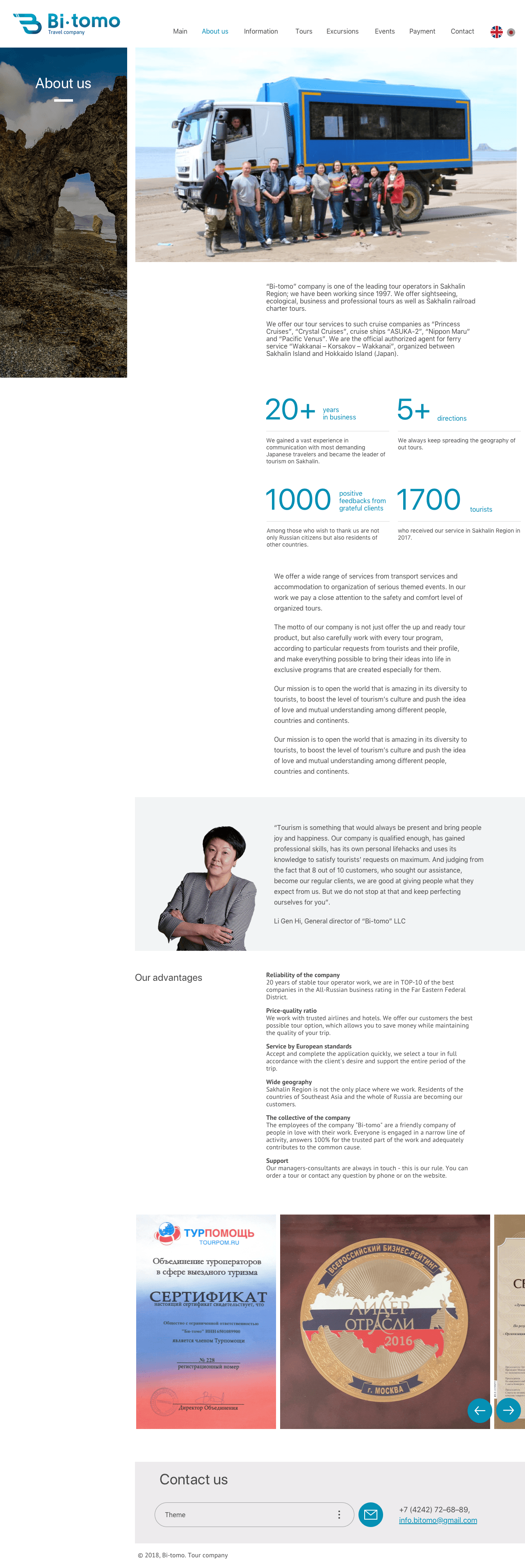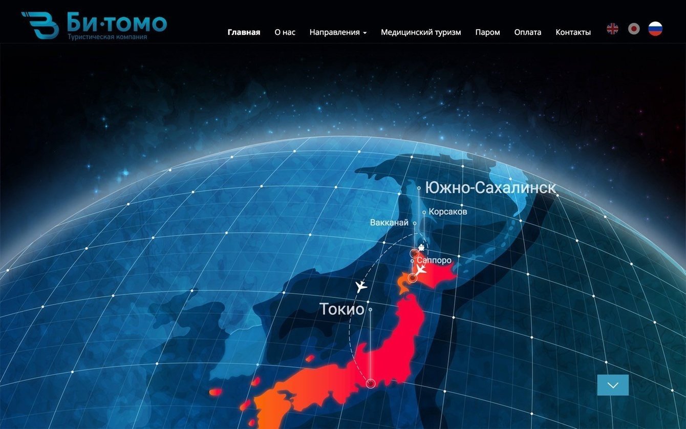 Разработать сайт туристической компании, ориентированный как на граждан РФ, так и на англоговорящую и японоговорящую аудиторию. Из главных просьб — очень просили визуализировать на первом экране направления, которыми занимается компания и разработать понятную панель администратора.