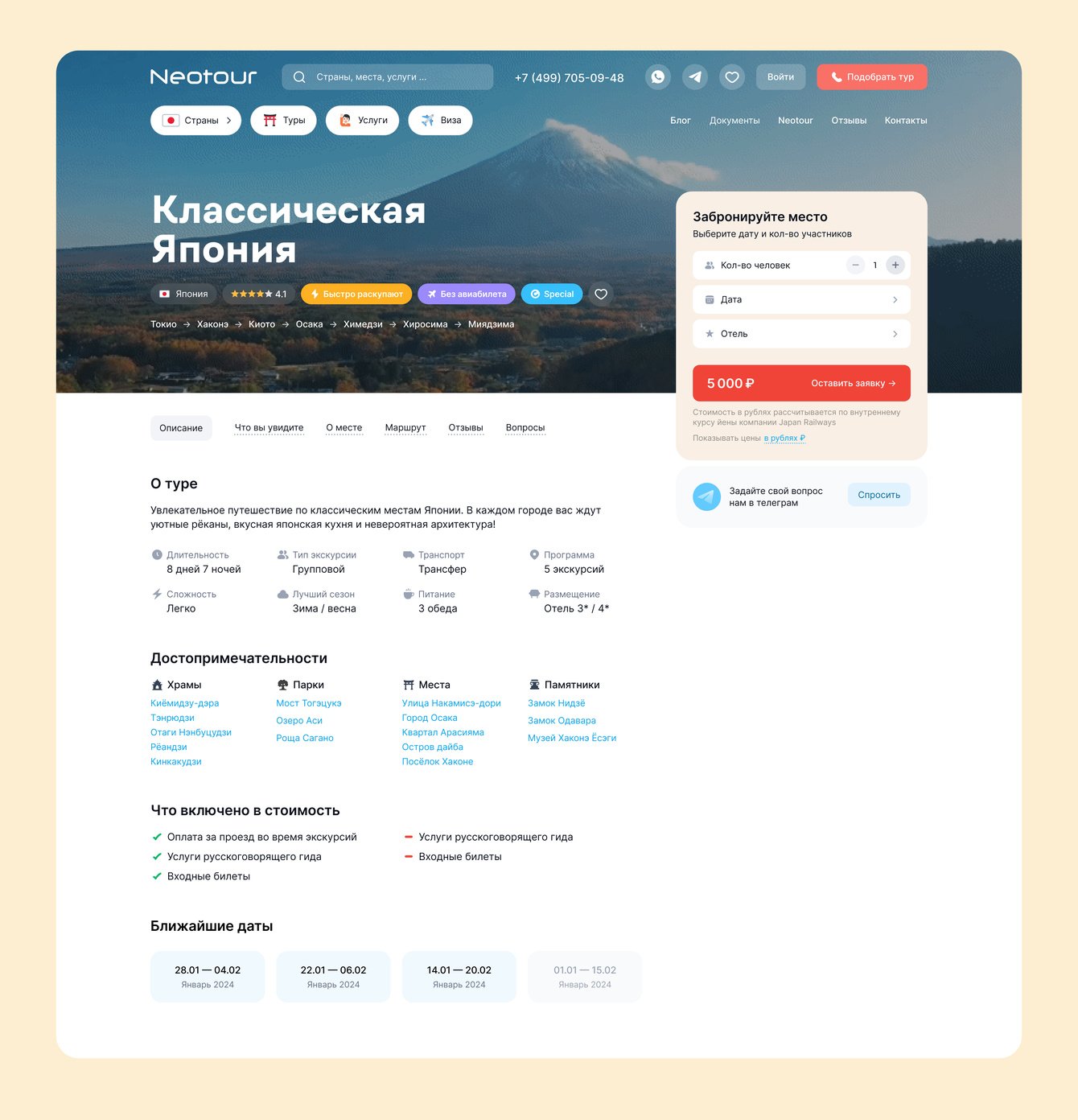 Но самым важным элементом является страница одного тура. Здесь было важно собрать и представить всю информацию максимально подробно и структурно. Не забыв, при этом, показать атмосферу тура в большом промо.
