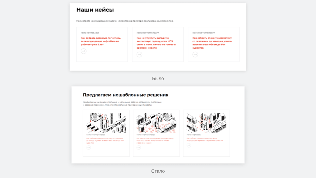 Главная сложность этого кейса — трудная тема, в которой пришлось досконально разбираться. Мы узнали, что такое потеря продукта, затоварка, почему для перевозки мазута нужны особые цистерны, как прокладывают маршруты и подбирают транспорт. Важно было не только переписать тексты, но и не ошибиться в смыслах.