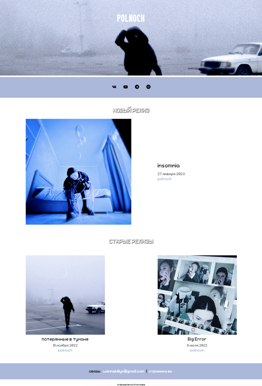 Сайт-визитка для polnoch Кроссбраузерная вёрстка, верстка на основе своих идей, состояния при повороте экрана, семантическое использование тегов, семантические названия атрибутов, валидная вёрстка, реализация сетки..