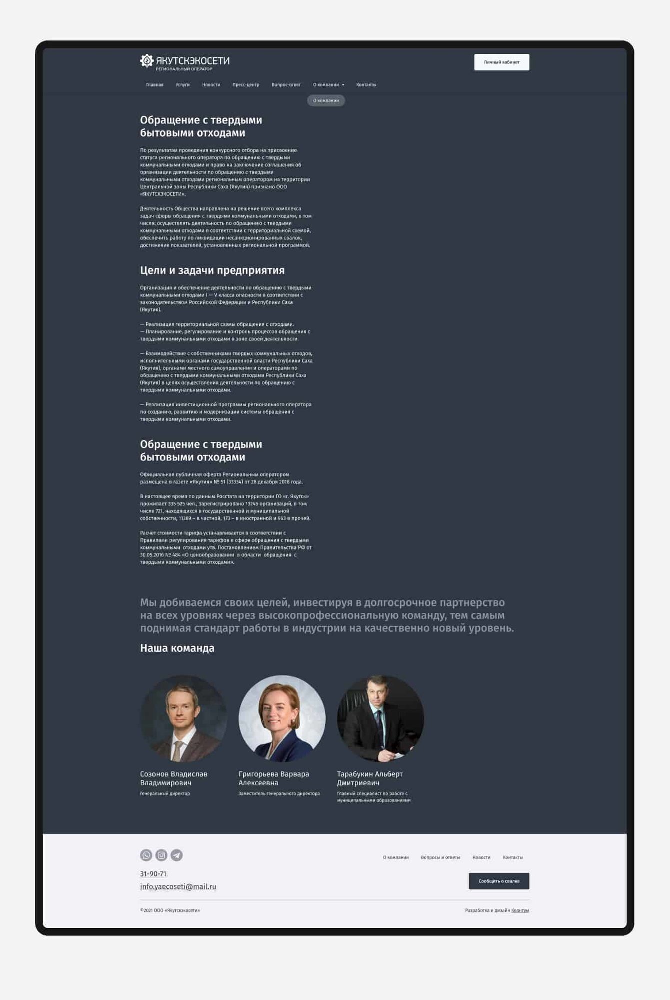 Разработать корпоративный портал для компании «Якутскэкосети». Сайт должен формировать имидж надежного делового партнера, быть максимально удобным для пользователей, а также подчеркивать строгую корпоративную этику компании.