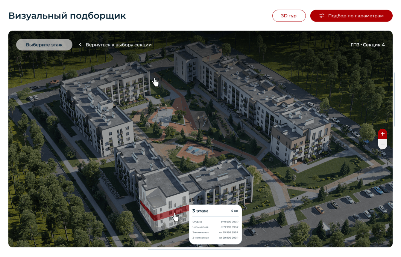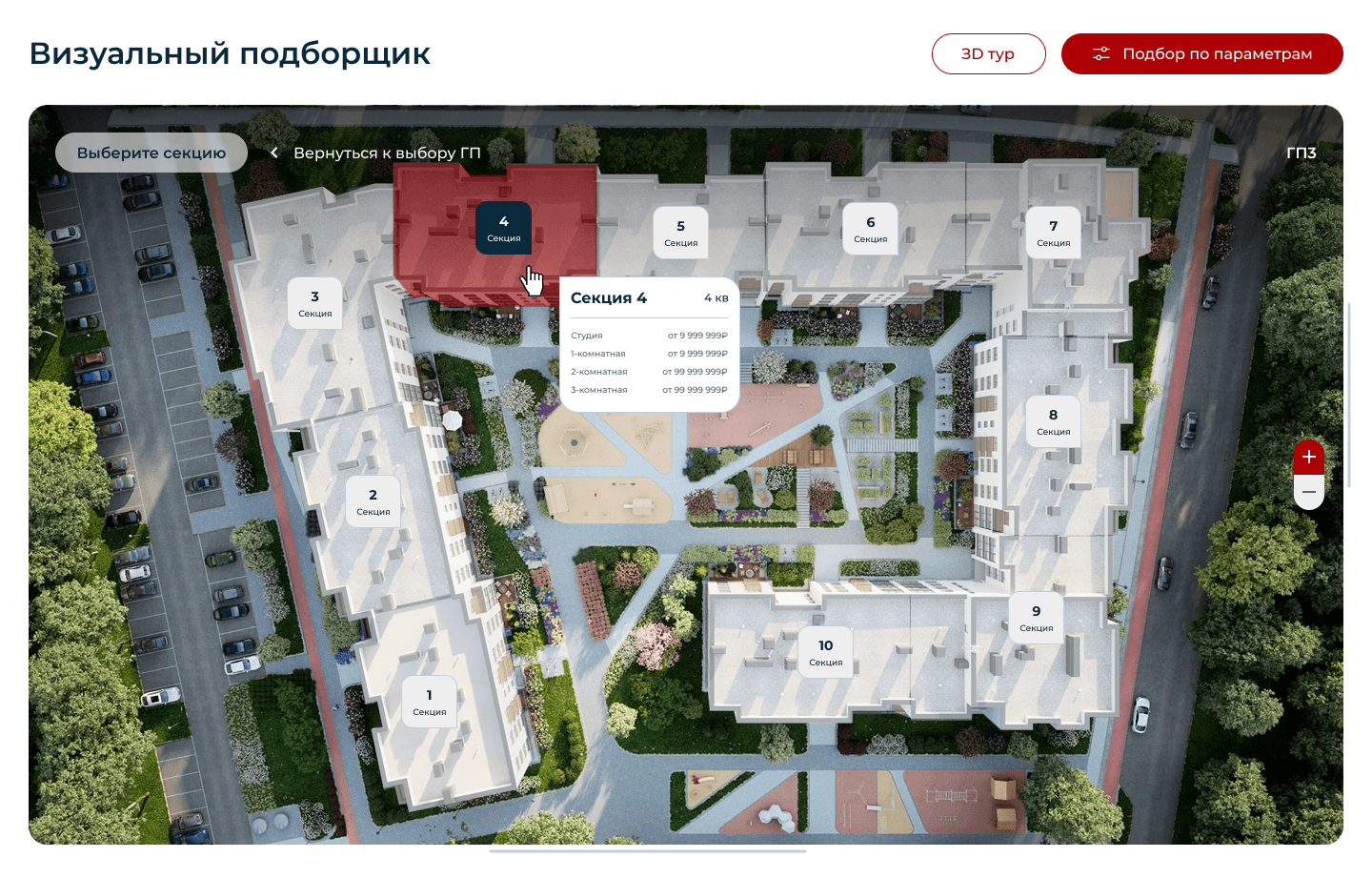 Выбор недвижимости максимально интерактивен. На сайте используются карты, где пользователи могут увидеть расположение строящихся объектов относительно инфраструктуры города, визуальные подборщики помещений, параметрические подборщики.