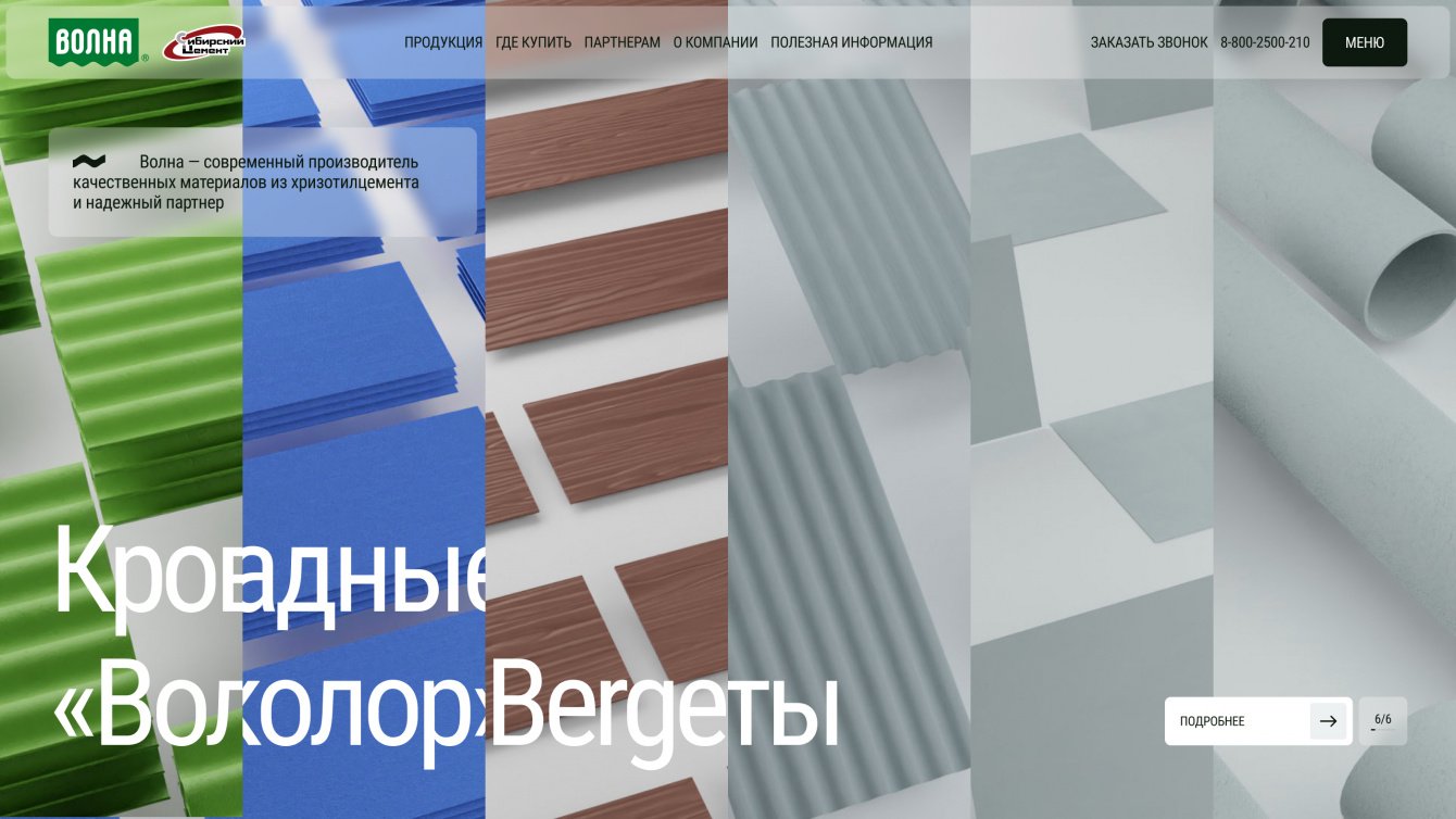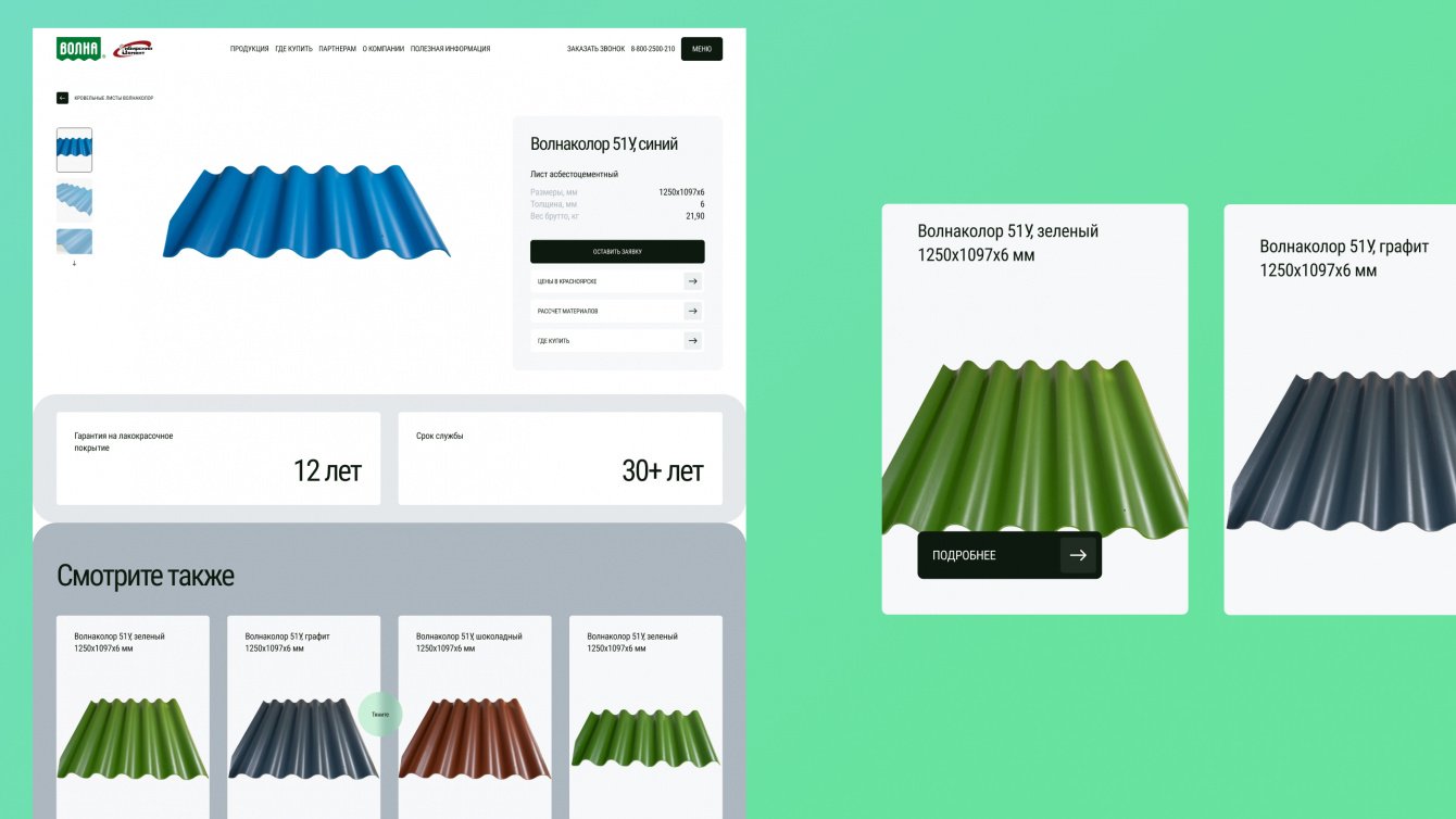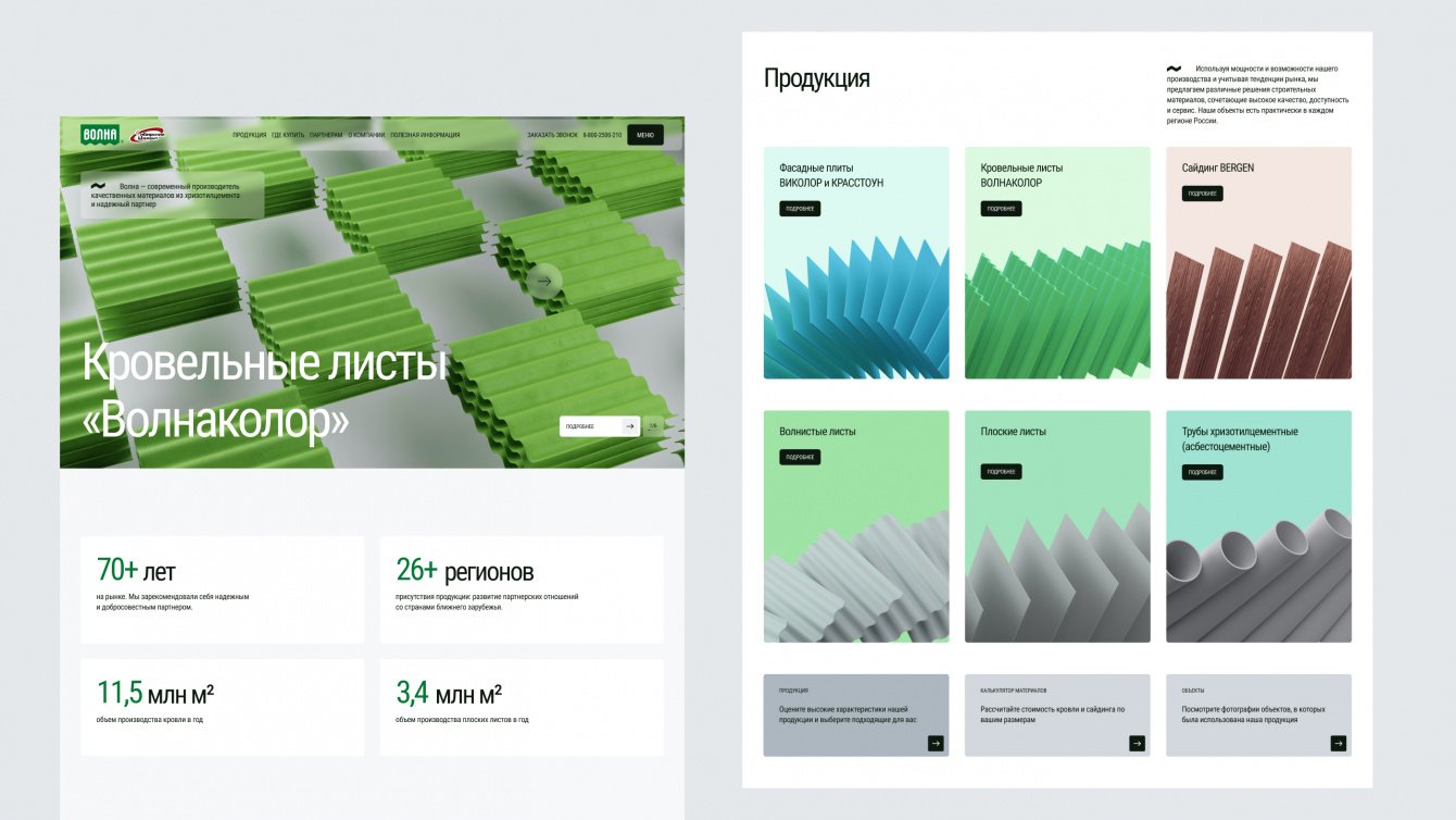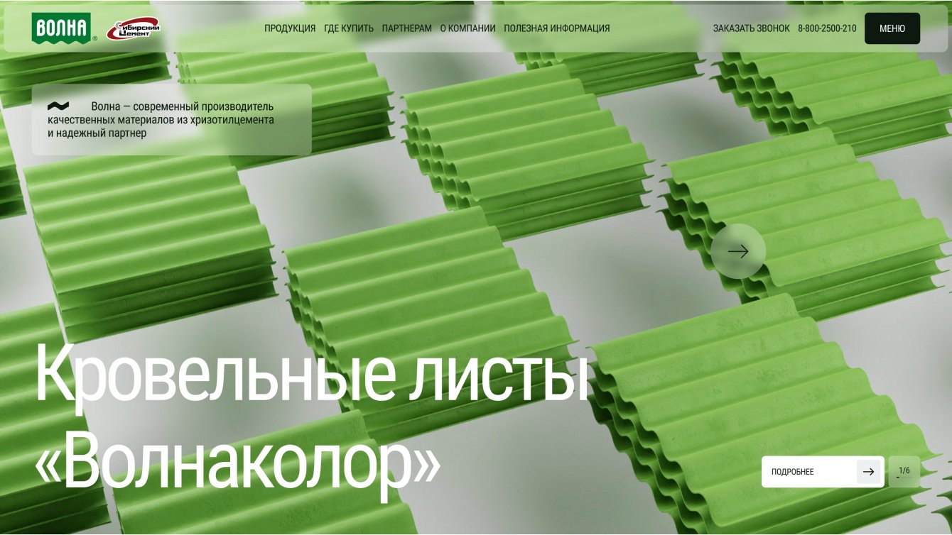 «Волна» — одно из ведущих предприятий в хризотилцементной промышленности России. Заказчику крайне важно показать клиентам свою экспертизу и актуальность в сфере кровельных решений. Предыдущая версия сайта имела устаревший дизайн и не была адаптирована для мобильных устройств, что затрудняло его использование. Поэтому нашей задачей стало создание современного и функционального веб-ресурса с впечатляющим дизайном.