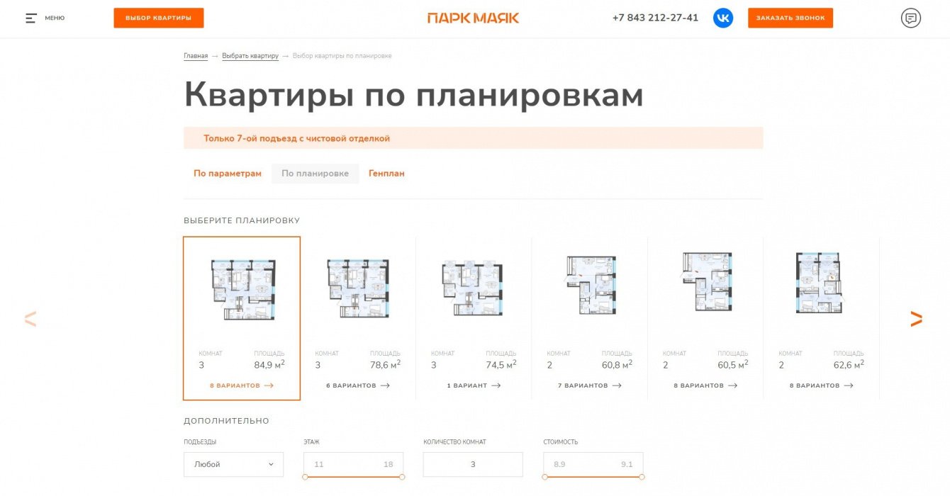 1. По параметрам. В фильтре можно выбрать подъезд, этаж, количество комнат, площадь, стоимость — и появятся релевантные запросу квартиры.
