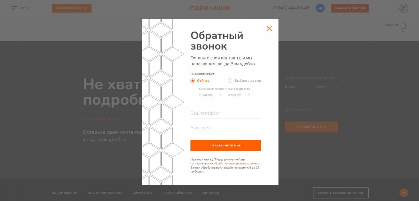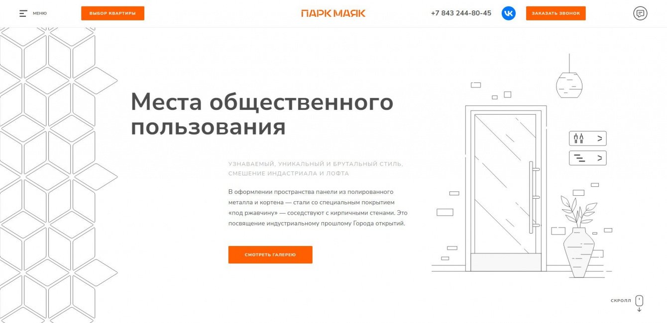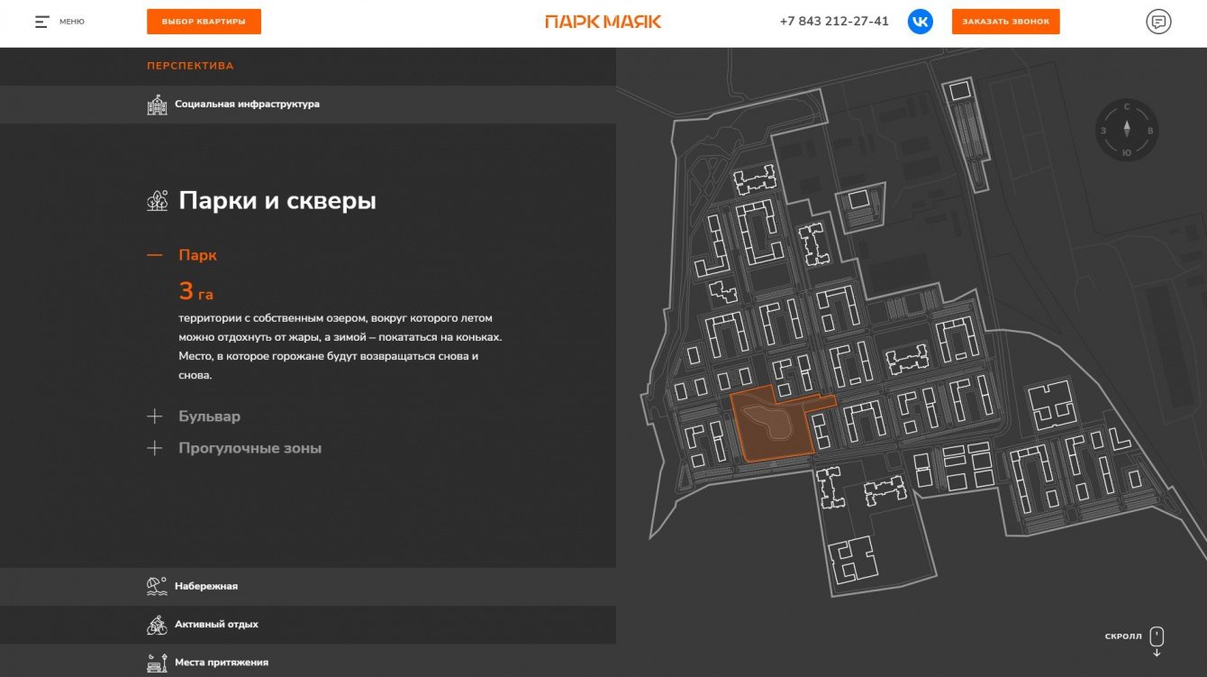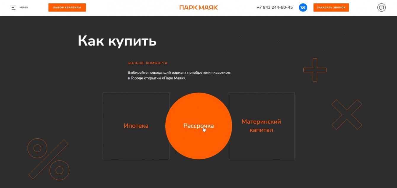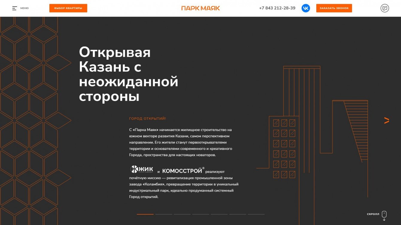 За созданием сайта к нам обратился союз двух застройщиков, которые возводят жилой комплекс «Парк Маяк» в Казани. В новом ЖК предлагают квартиры комфорт-класса — от небольших студий до «трешек» с двумя санузлами и лоджиями в каждой комнате.