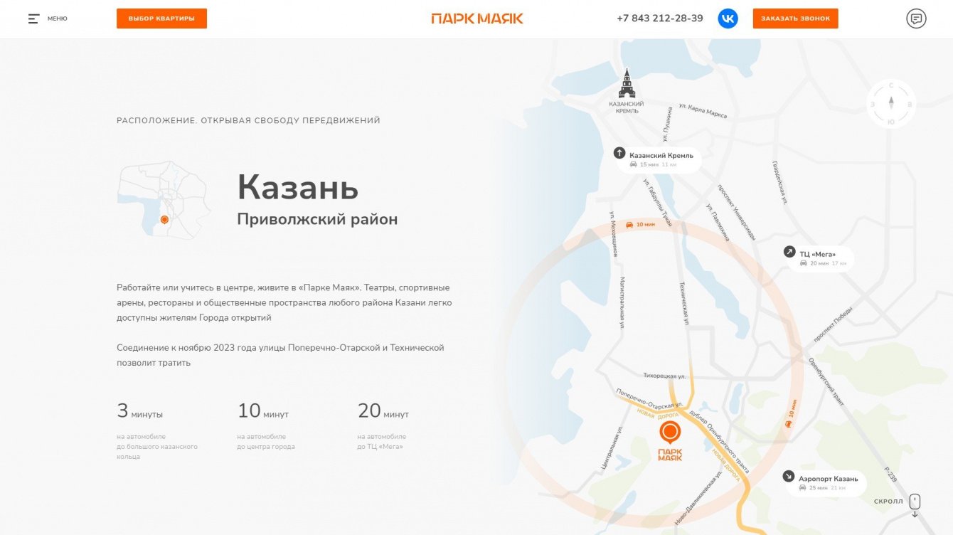 В одном из блоков акцент сделан на важных факторах при покупке недвижимости — местоположении ЖК и транспортной доступности. Для наглядности размещена карта с дорогами, 10-минутной зоной передвижения на автомобиле и временем поездки до знаковых мест — Казанского Кремля, аэропорта, крупного торгового центра.