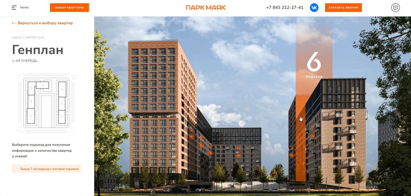 На момент окончания web-разработки было доступно бронирование недвижимости в 7-подъездном доме. Общий масштаб ЖК — порядка 10 тысяч квартир.