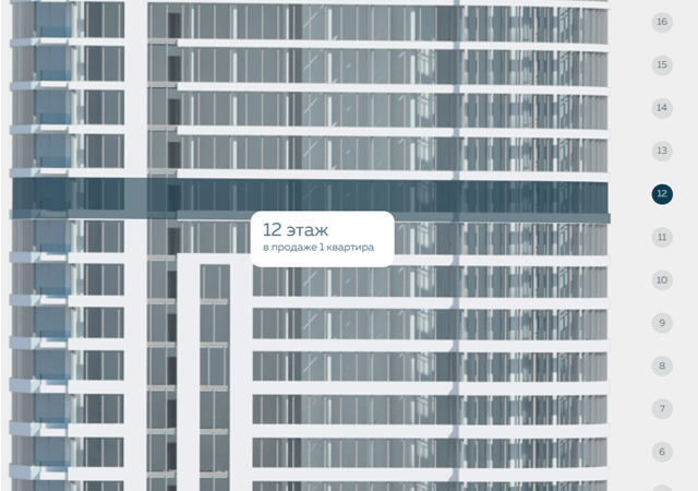 Визуально в анимированном доме подсвечиваются этажи при наведении на уровень этажа мышкой. При выборе этажа открывается ген. план с квартирами. Каждая квартира находящаяся в статусе «продажа» подсвечивается (оранжевым). Проданные квартиры при наведении мышкой не подсвечиваются. Также снизу располагается меню – Выбор по параметрам (этаж- тип квартиры - Комнат (кол-во) - Площадь м2). Все открытия и отображения данной вкладки должны быть заранее оптимизированы скриптами.