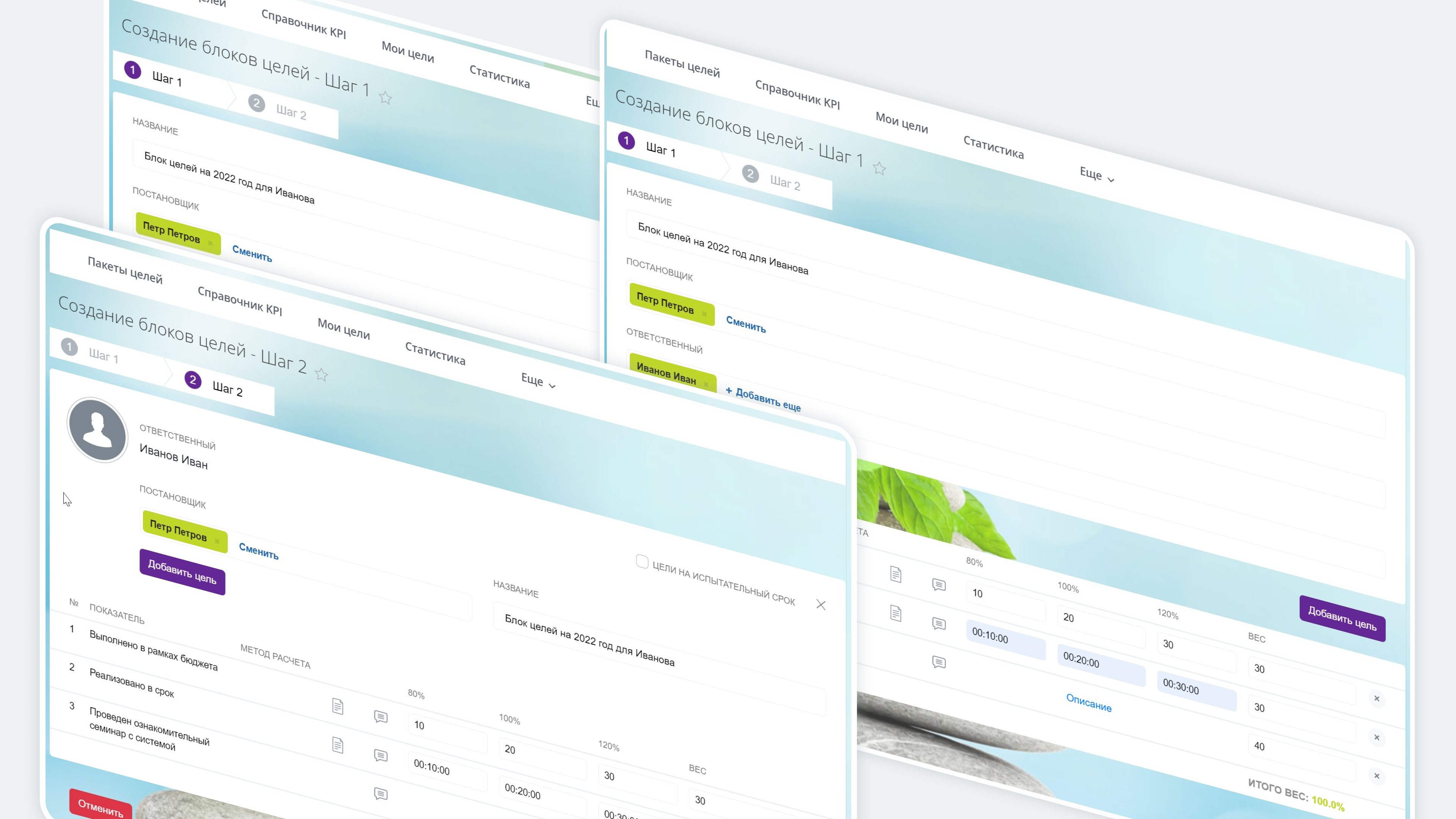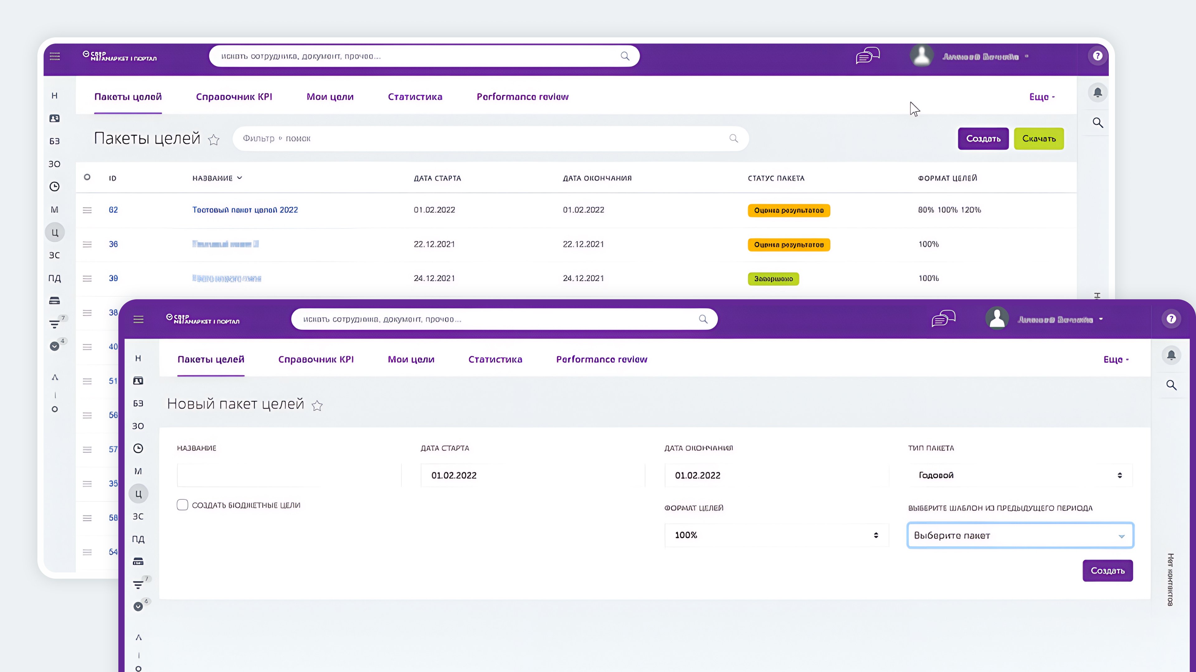 Процесс целеполагания запускается с определённой периодичностью, имеет протяжённость и ряд других параметров. Чтобы настраивать этот процесс в системе создана сущность с названием “Пакет целей”. Пакет целей - это отдельная процедура целеполагания со своим набором настроек.