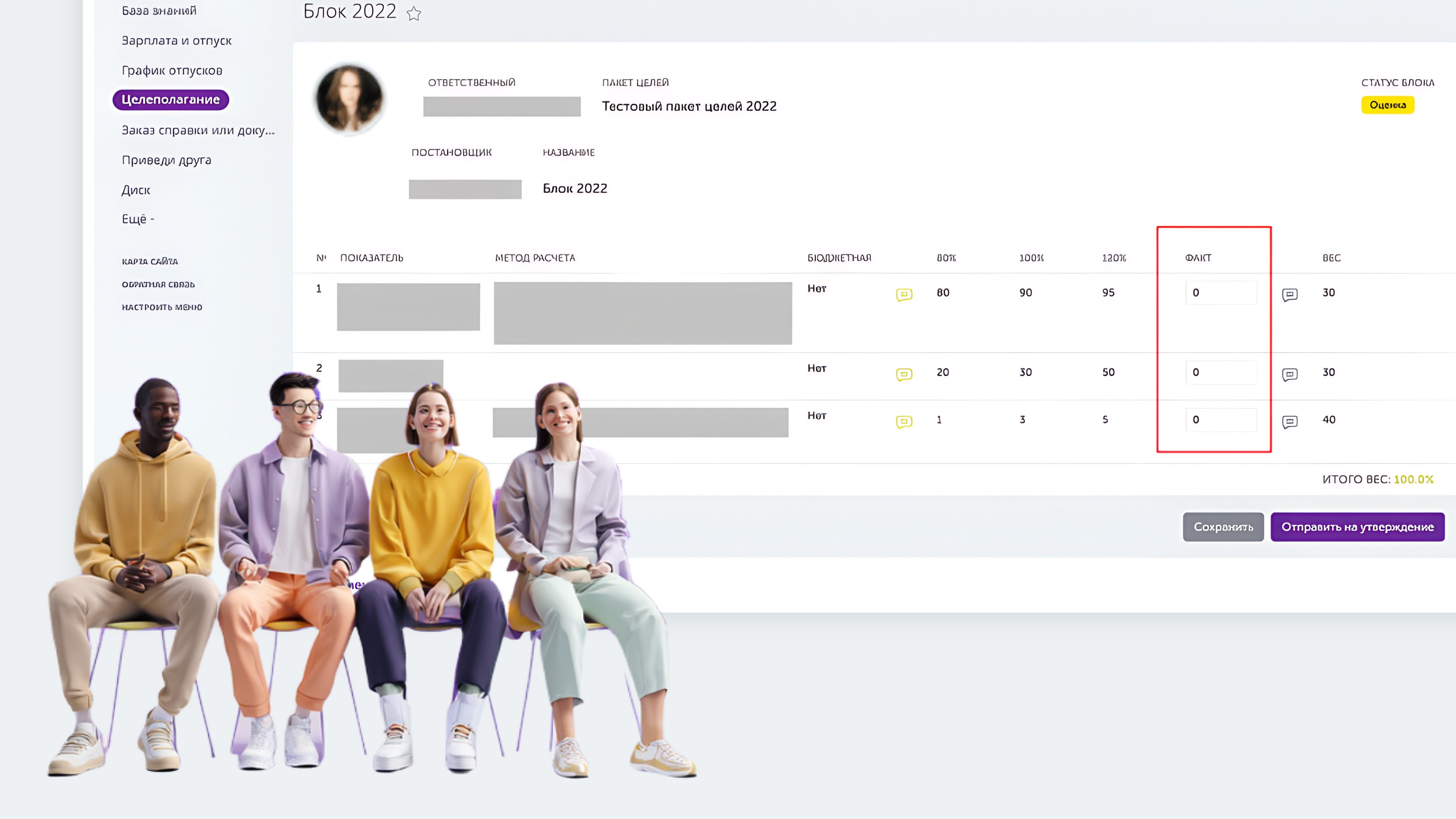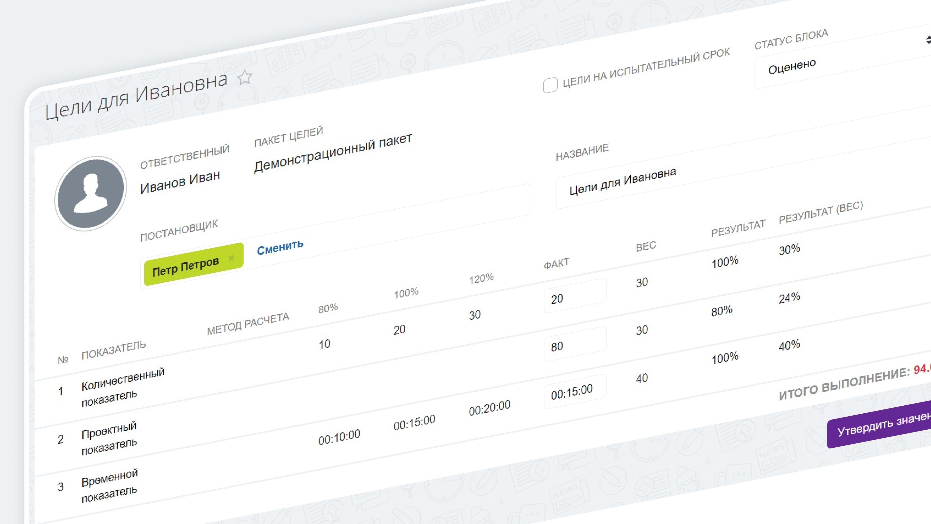 В конце периода работы пакета целей администратор меняет статус пакета на “Оценка”. После этого у сотрудника появляется возможность внести фактические показатели и отправить их на проверку.