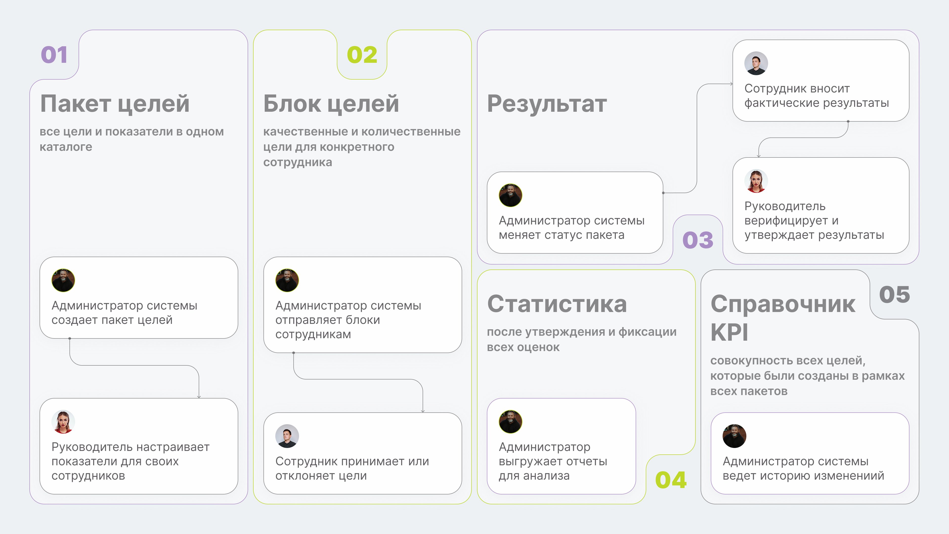 Для того, чтобы автоматизировать процессы работы с KPI в СберМегаМаркете мы разработали модуль “Целеполагание”. С помощью модуля руководители выставляют цели каждому сотруднику компании. По итогам периода сотрудник с помощью модуля фиксирует фактические результаты по своим целям. Результаты верифицируются и фиксируются в системе. На основе результатов и справочников KPI система рассчитывает уровень выполнения KPI для каждого сотрудника. Далее разберём работу модуля пошагово.