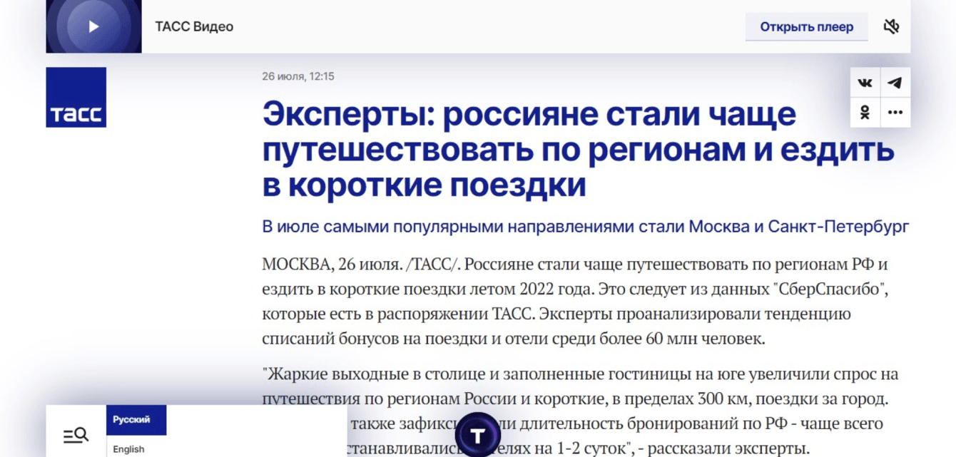 1. Публиковали серию новостей про раздел «Тревел» от СберСпасибо в Интерфаксе, Коммерсанте, ТАСС, Lenta.ru, Известиях, Газете.Ru. Получили более 700 упоминаний в федеральных и региональных СМИ.