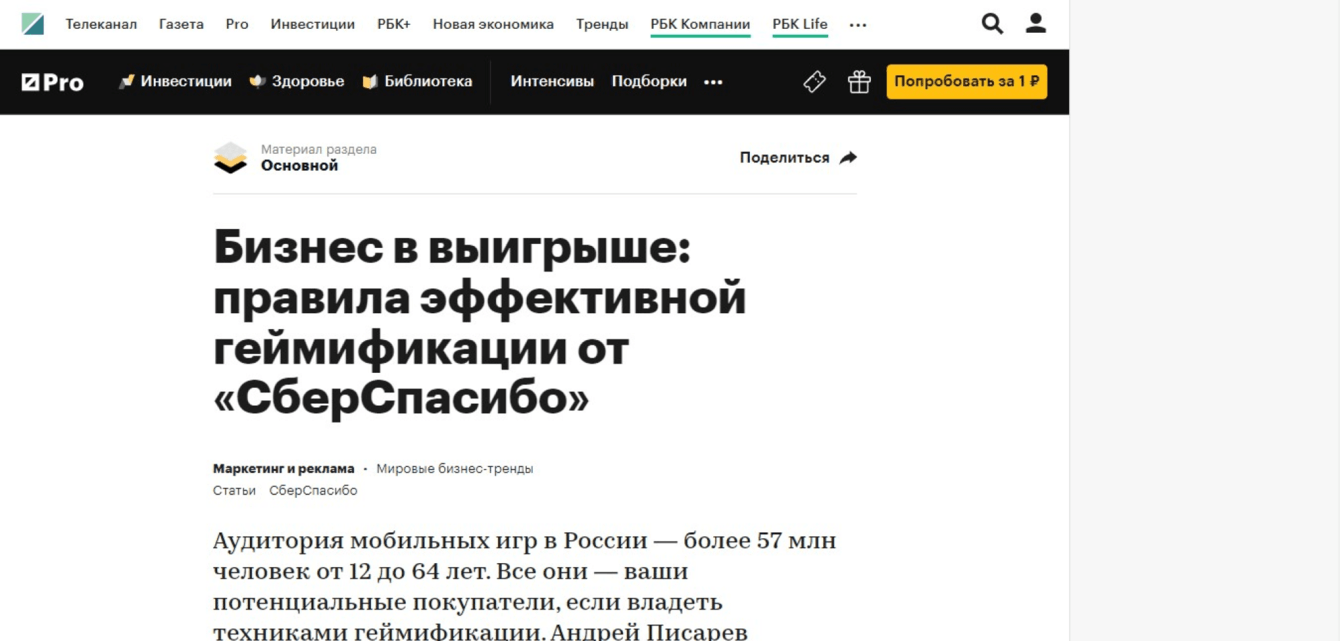 3. Позиционировали СберСпасибо трендсеттером в запуске геймификации. Генеральный директор Андрей Писарев дал комментарий «Эксперту»: рассказал о геймификации как дополнительном канале привлечения трафика. Мы пошли дальше: подготовили и опубликовали в РБК.Pro экспертную колонку о геймификации в банкинге. Вместе с Дмитрием Завишей проследили работающие и отжившие механики в программах лояльности и написали об этом статью для Skillbox Media.
