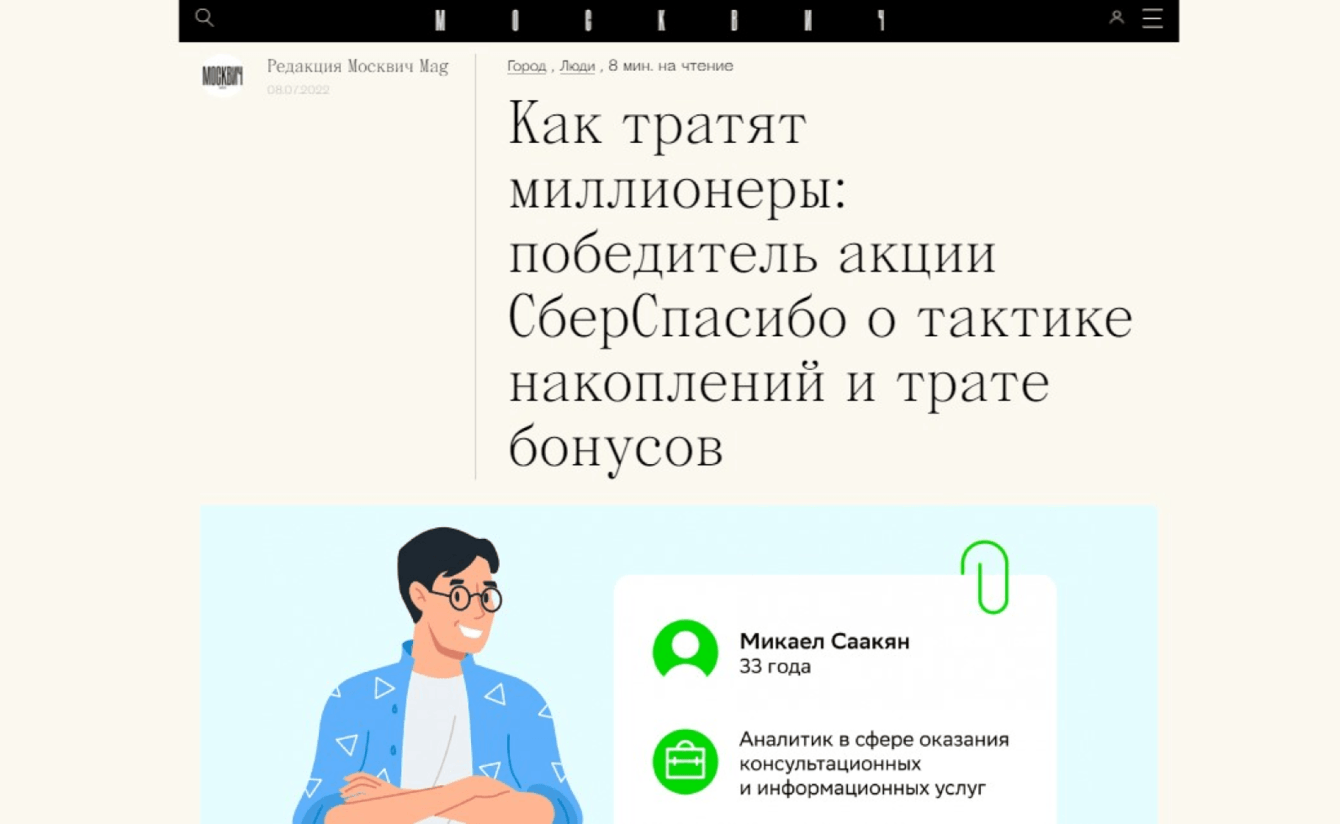 3. Выпустили с Москвич Mag спецпроект про бонусного миллионера: рассказали о реальном кейсе выигрыша миллиона бонусов и поделились лайфхаками разумной экономии.