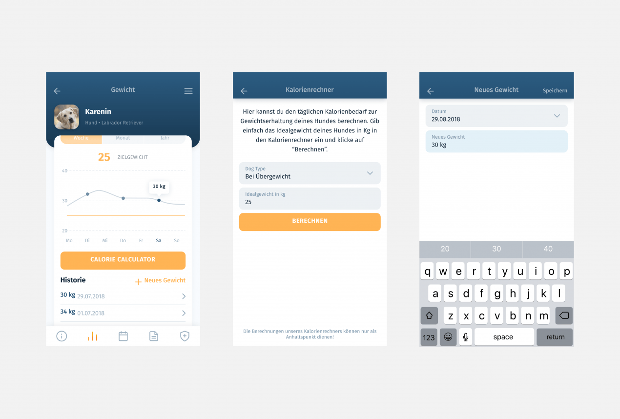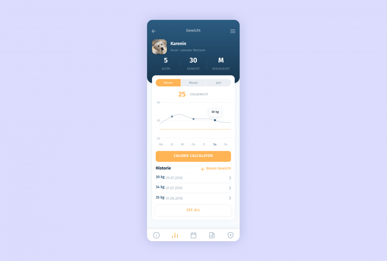 Еще одна болевая точка — график веса питомца. У заказчика был миллион реквестов на этот счет. Проблема была в том, что графики (шкалы) нужно было адаптировать под веса разных животных. Например, Чихуахуа и Мастифа. У них совершенно разные весовые категории и вес колеблется тоже совершенно по-разному: у Чихуа — в пределах пары кило, а у Мастифа может достигать ста килограмм. Вот и нужно было шкалировать график так, чтобы он и то, и другое показывал. Вот мы и шкалировали :)